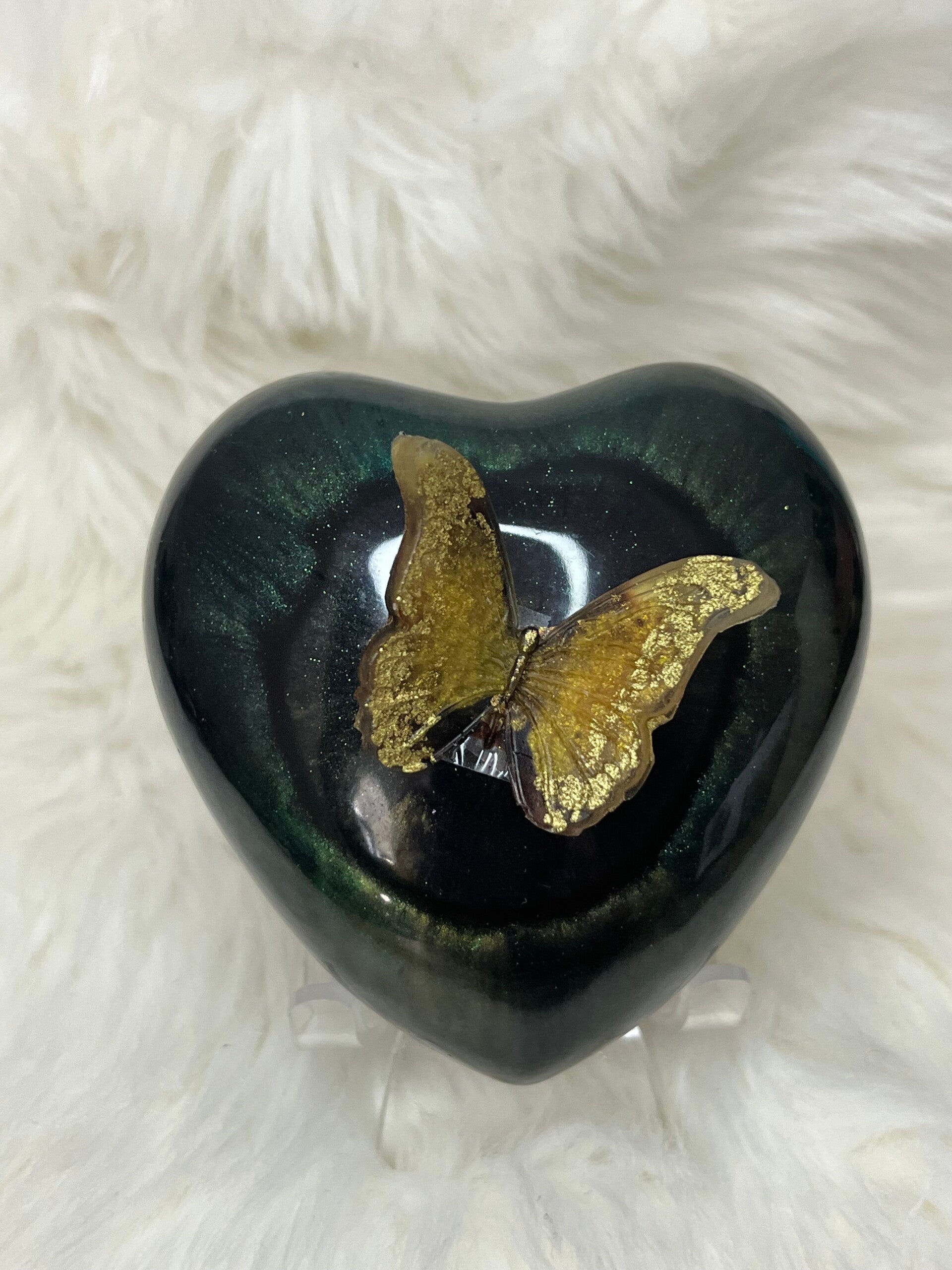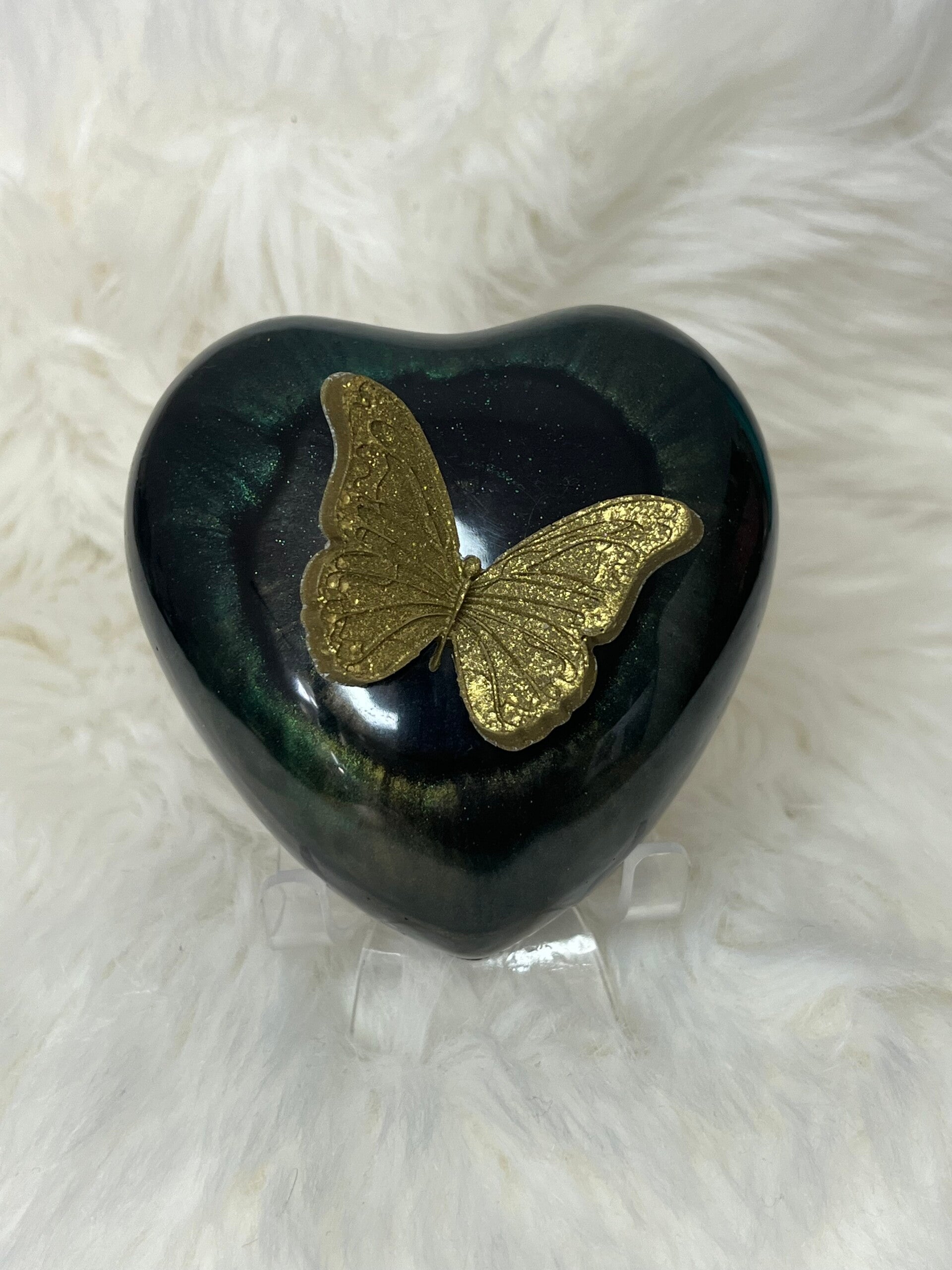 Prachtig en uniek ashart maat M in groen/brons/zwart met afsluitbare uitsparing voor as of haar. Eenvoudig te vullen en af te sluiten met de bijpassende afsluitdop.