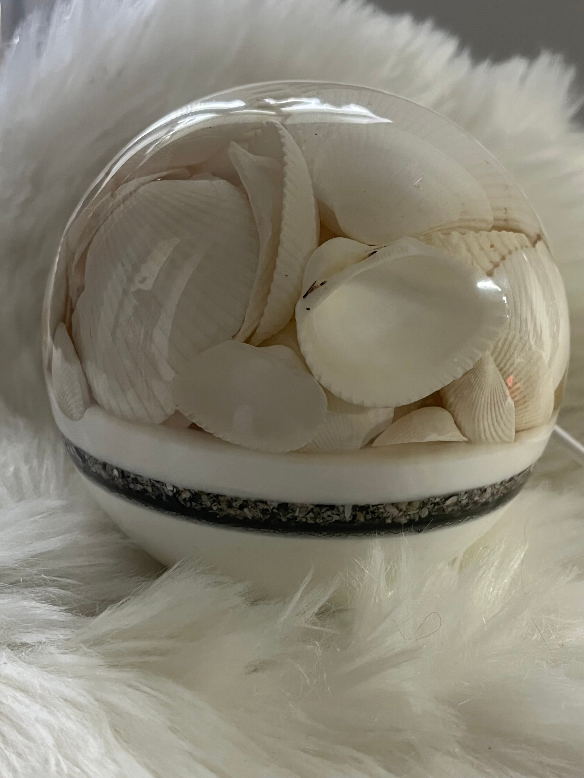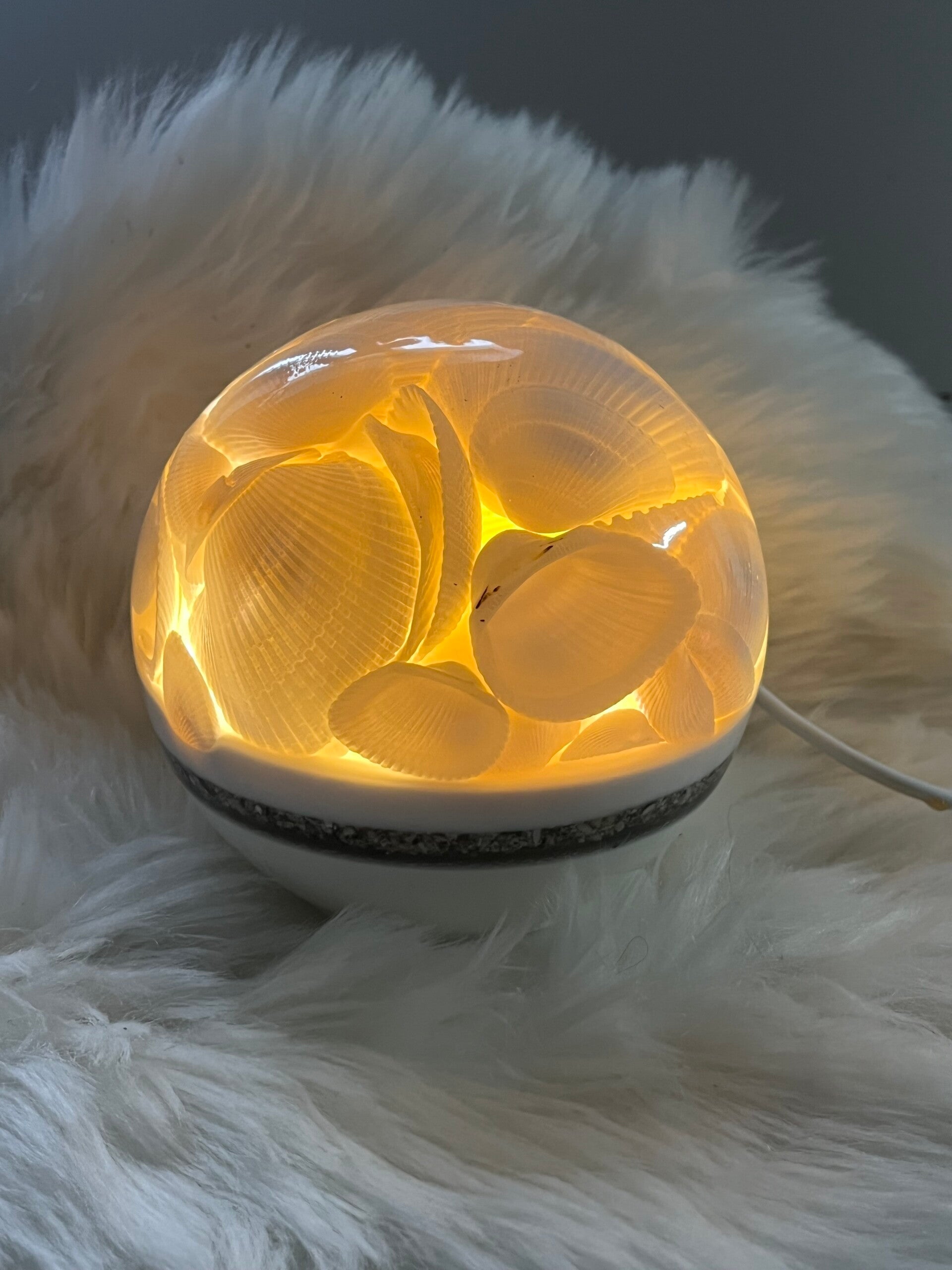 Supermooie schelpenlamp met vaste verlichting, (drie lichtstanden) en asverwerking (rand aan onderzijde zichtbaar)