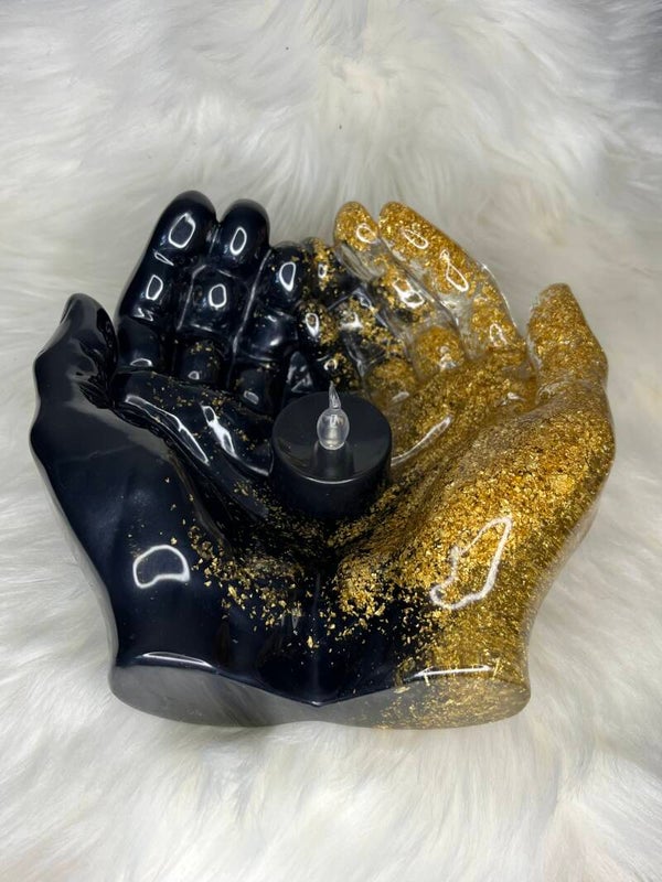Handenschaal in zwart en transparant/goud, gegoten met epoxy. Handwerk.