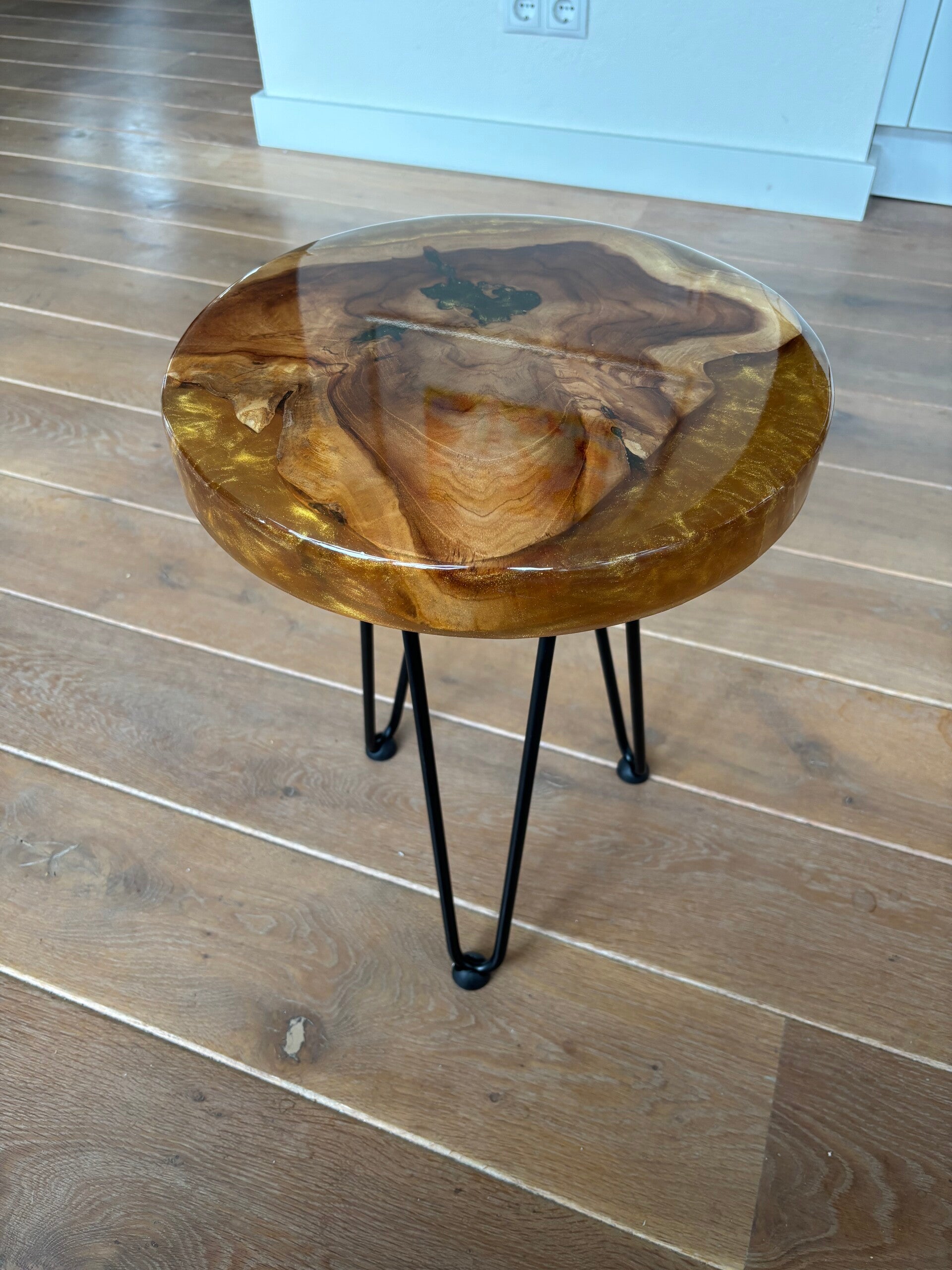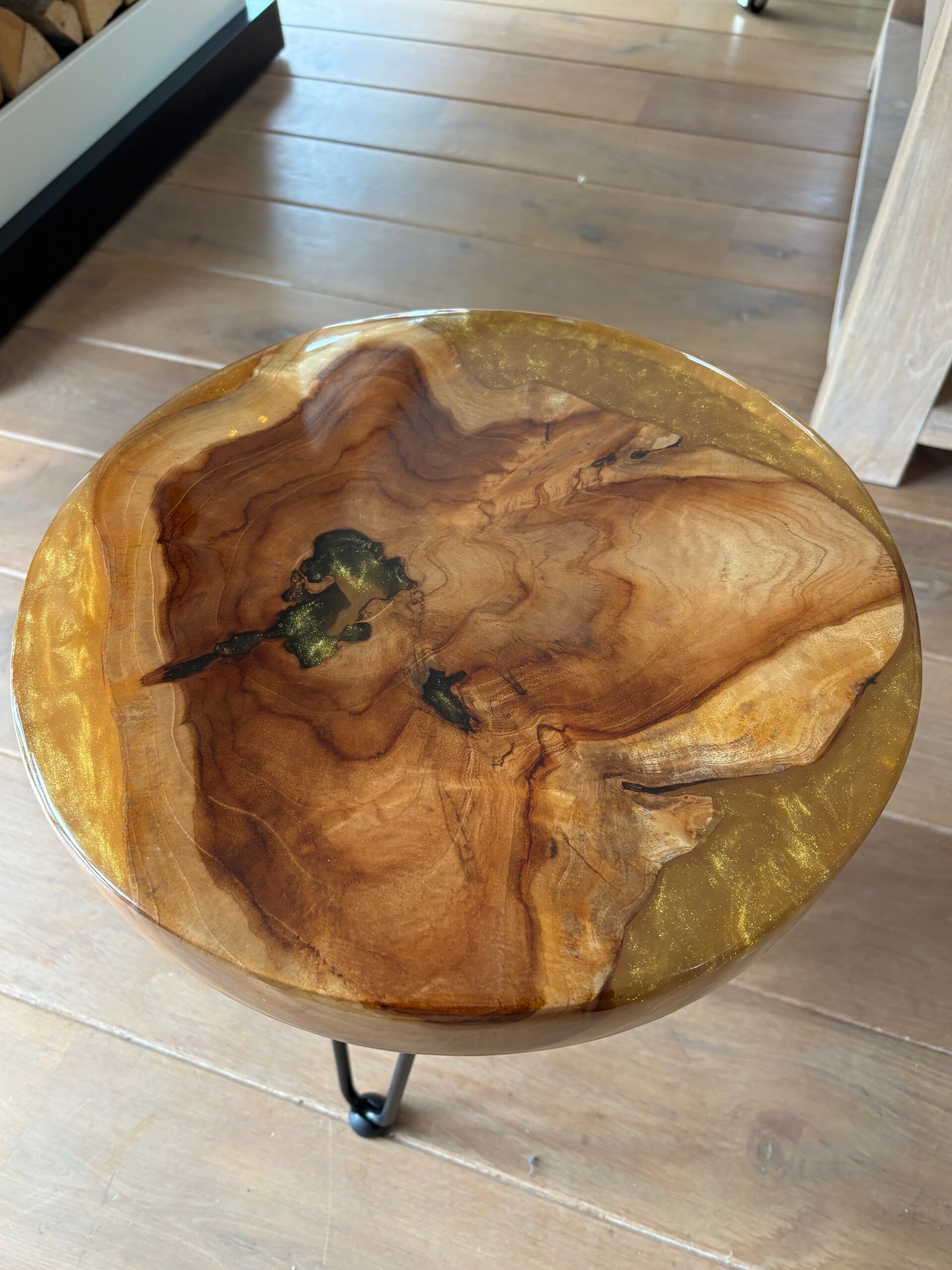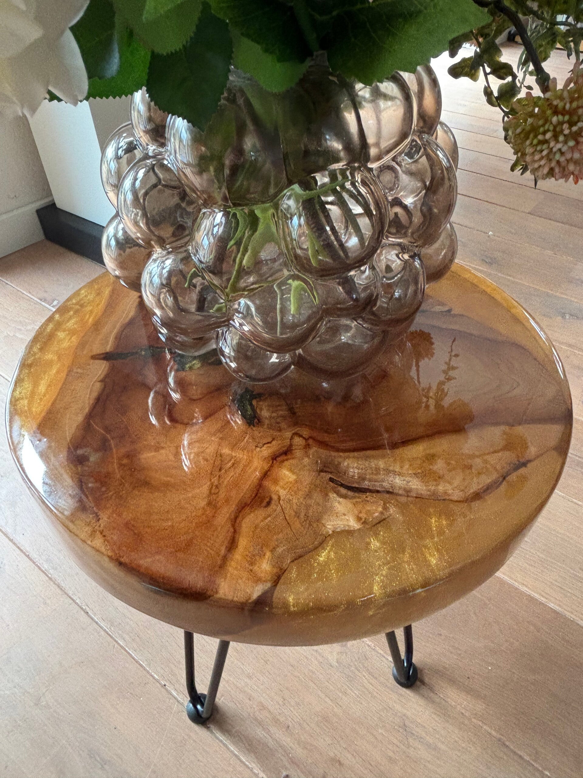 Bijzettafel epoxy transparent /goud met ingegoten houten schijf. Onderstel zwart staal.