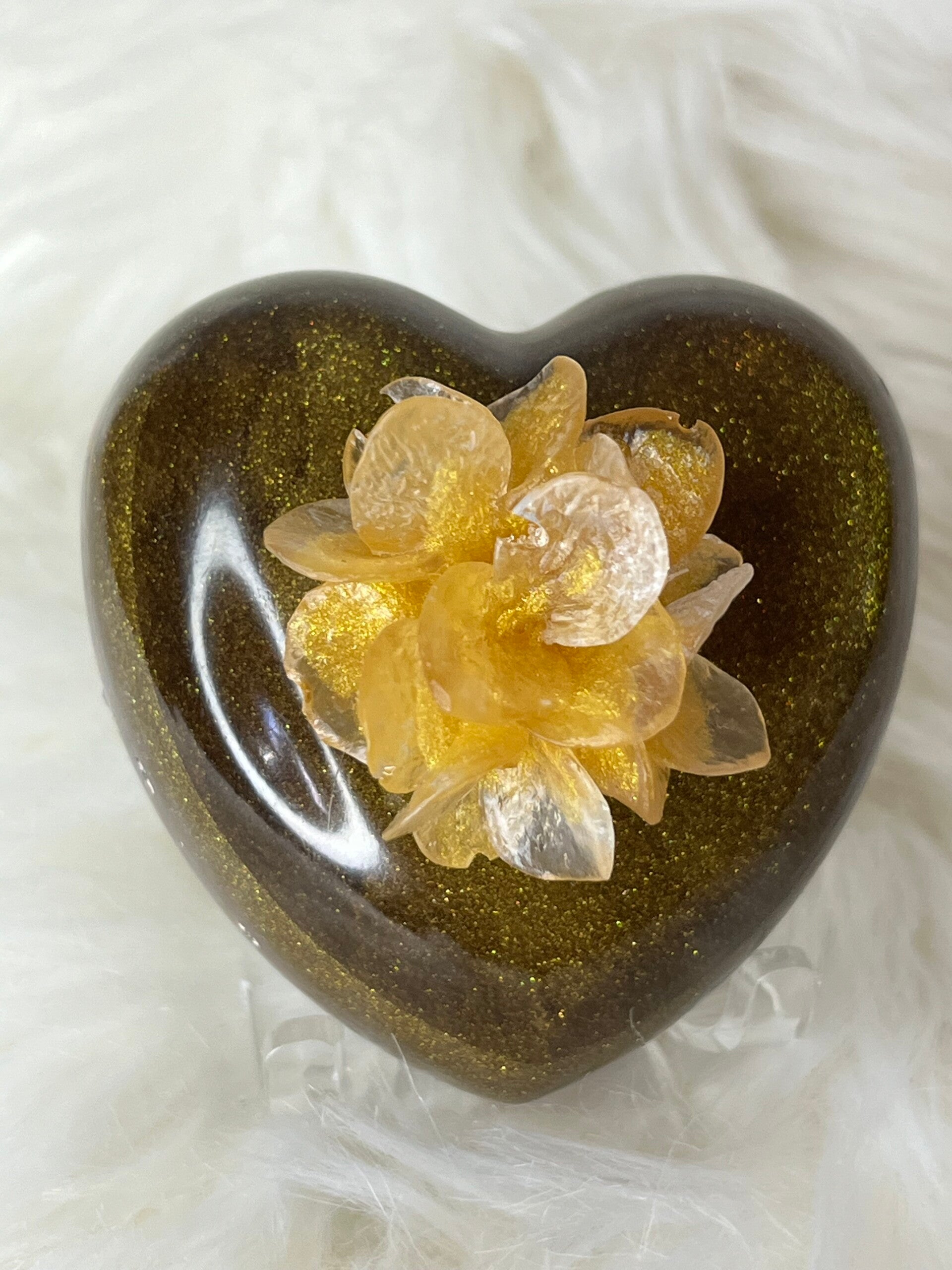 Prachtig ashart maat S brons/goud. Met afsluitbare uitsparing voor as of haar. Eenvoudig te vullen en af te sluiten met de bijpassende afsluitdop. Gegoten met epoxy, handwerk.
