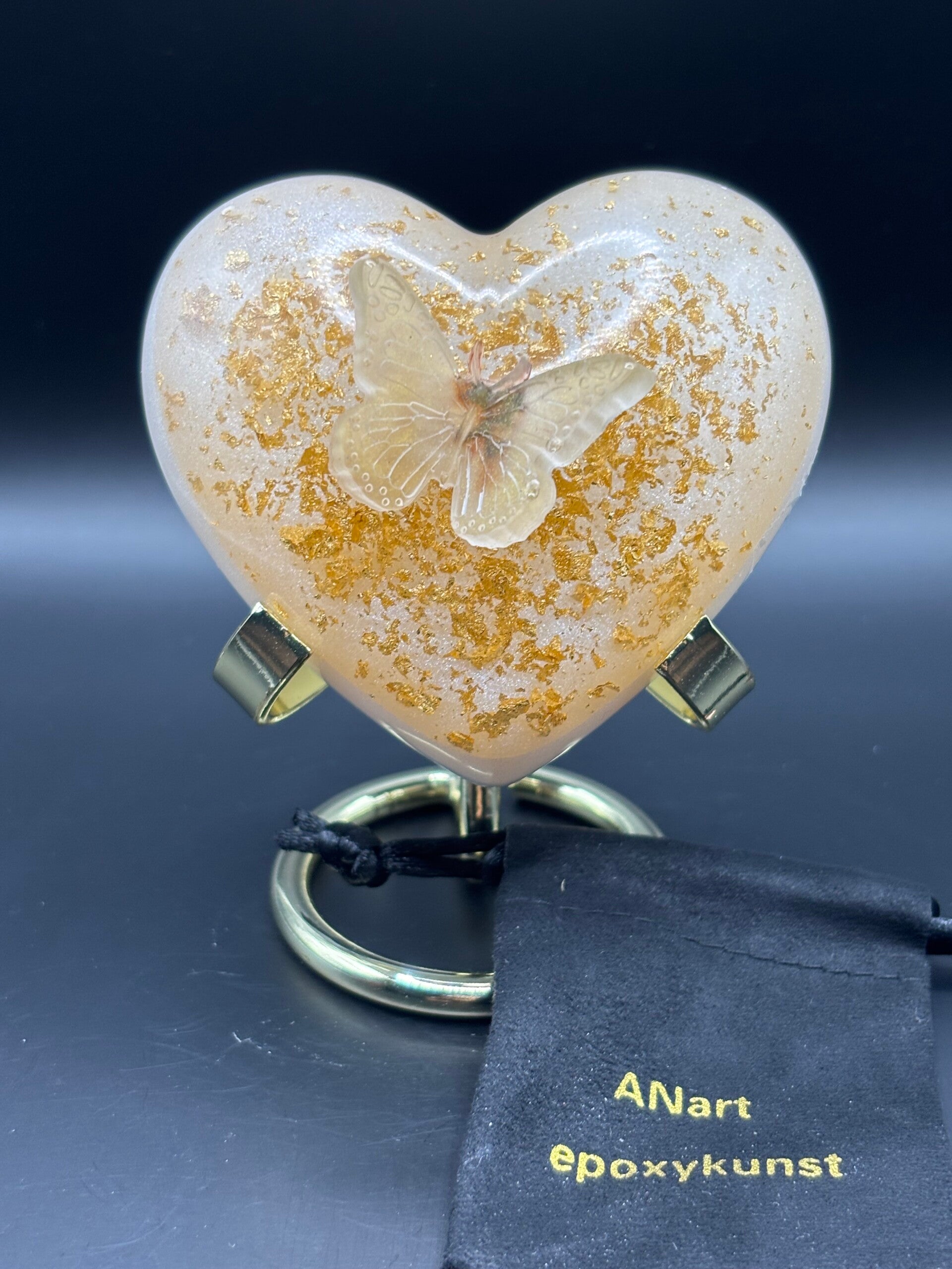 Prachtig ashart maat S in wit/goud. Met afsluitbare uitsparing voor as of haar. Eenvoudig te vullen en af te sluiten met de bijpassende afsluitdop. Gegoten met epoxy, handwerk.