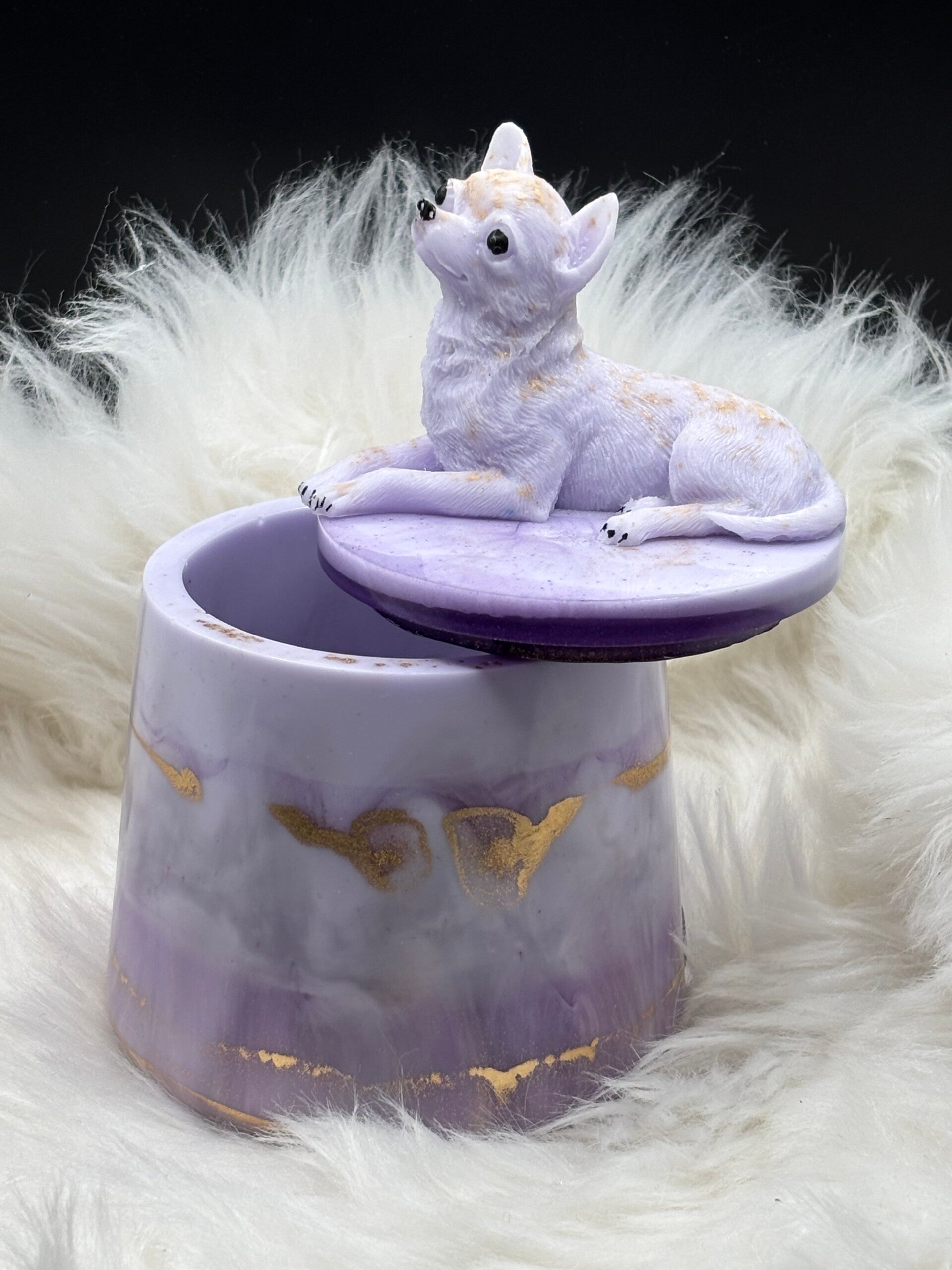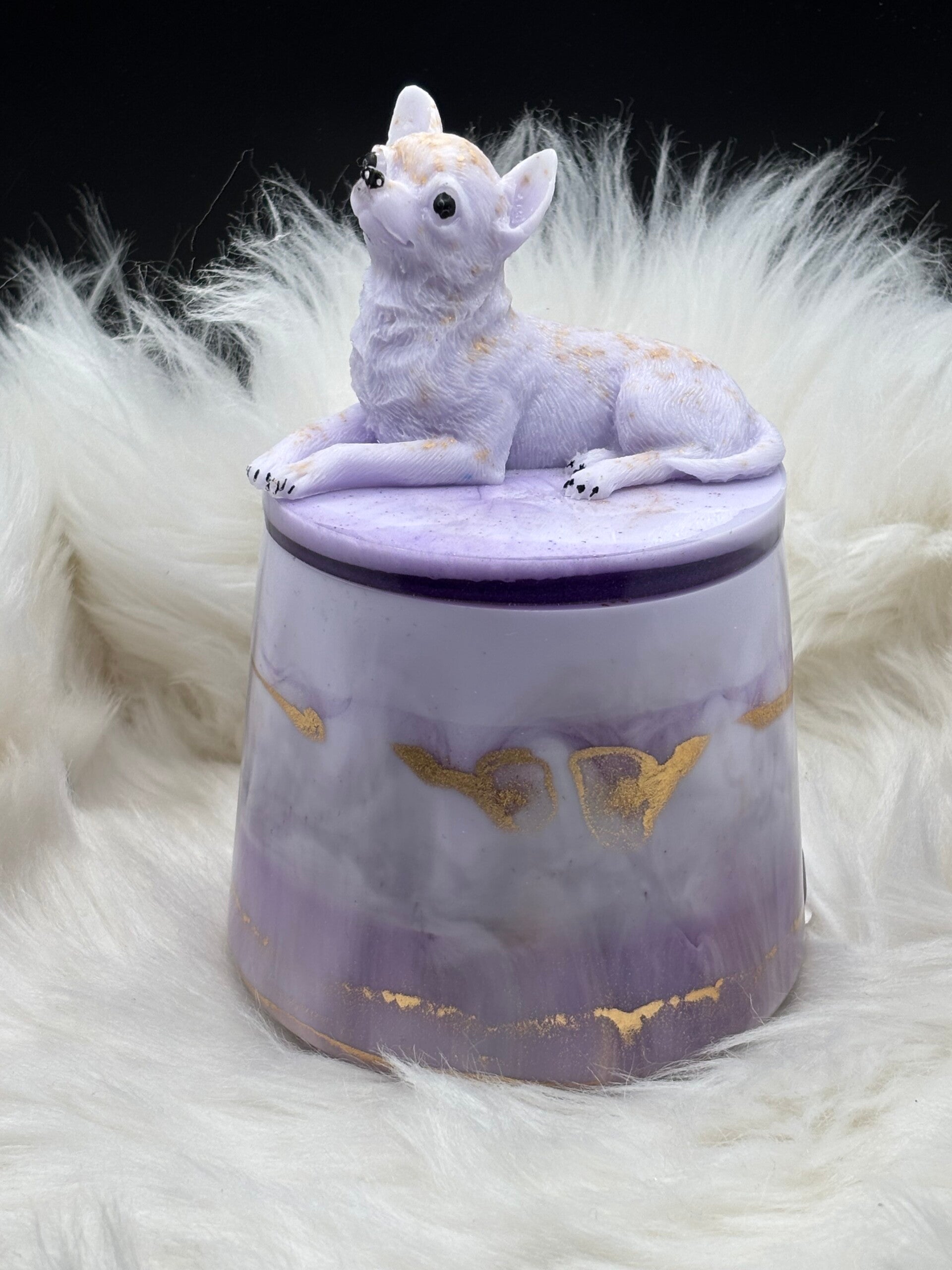 Zeer aparte as-urn voor as van een chihuahua in lilapaars/goud
