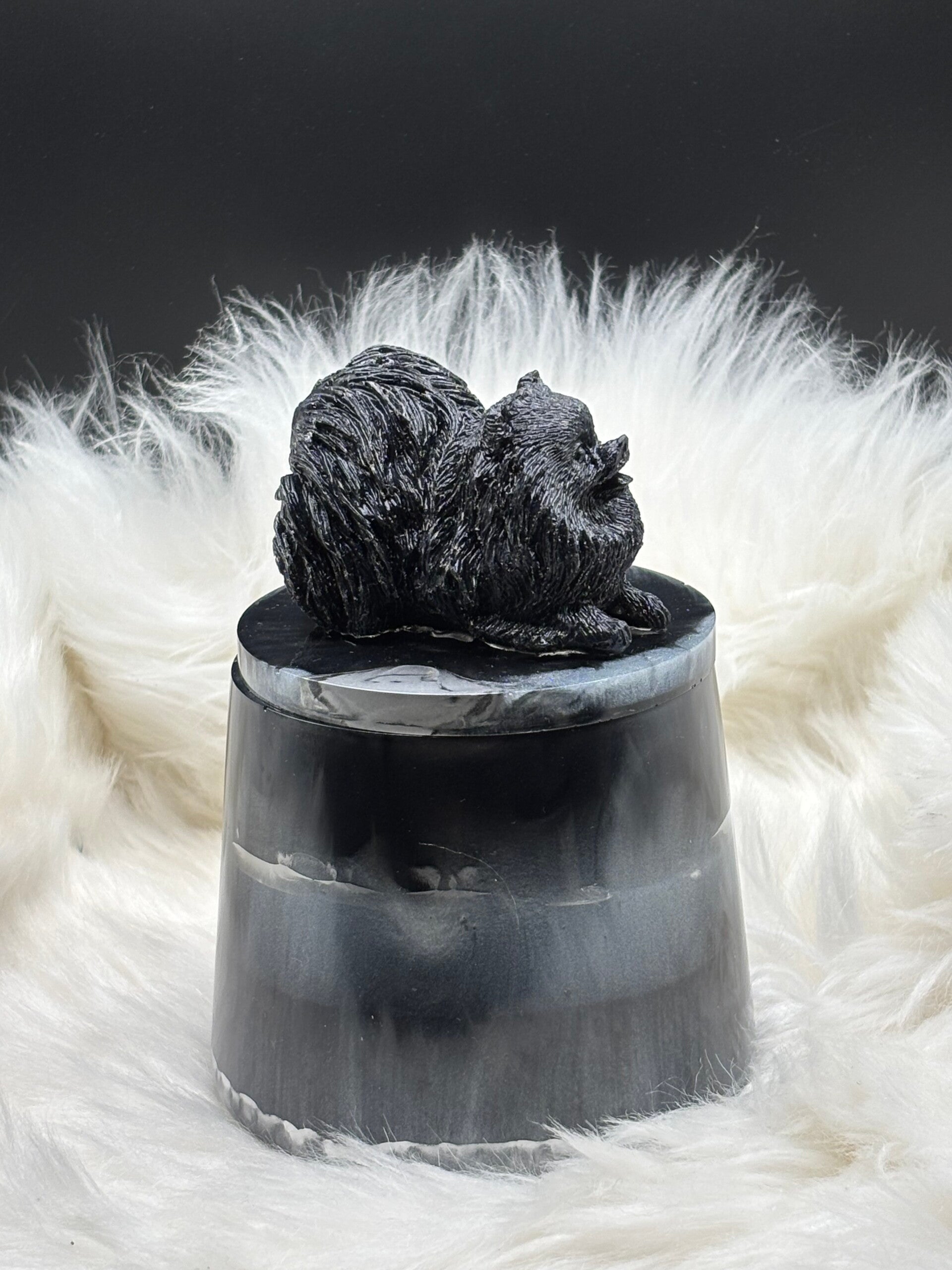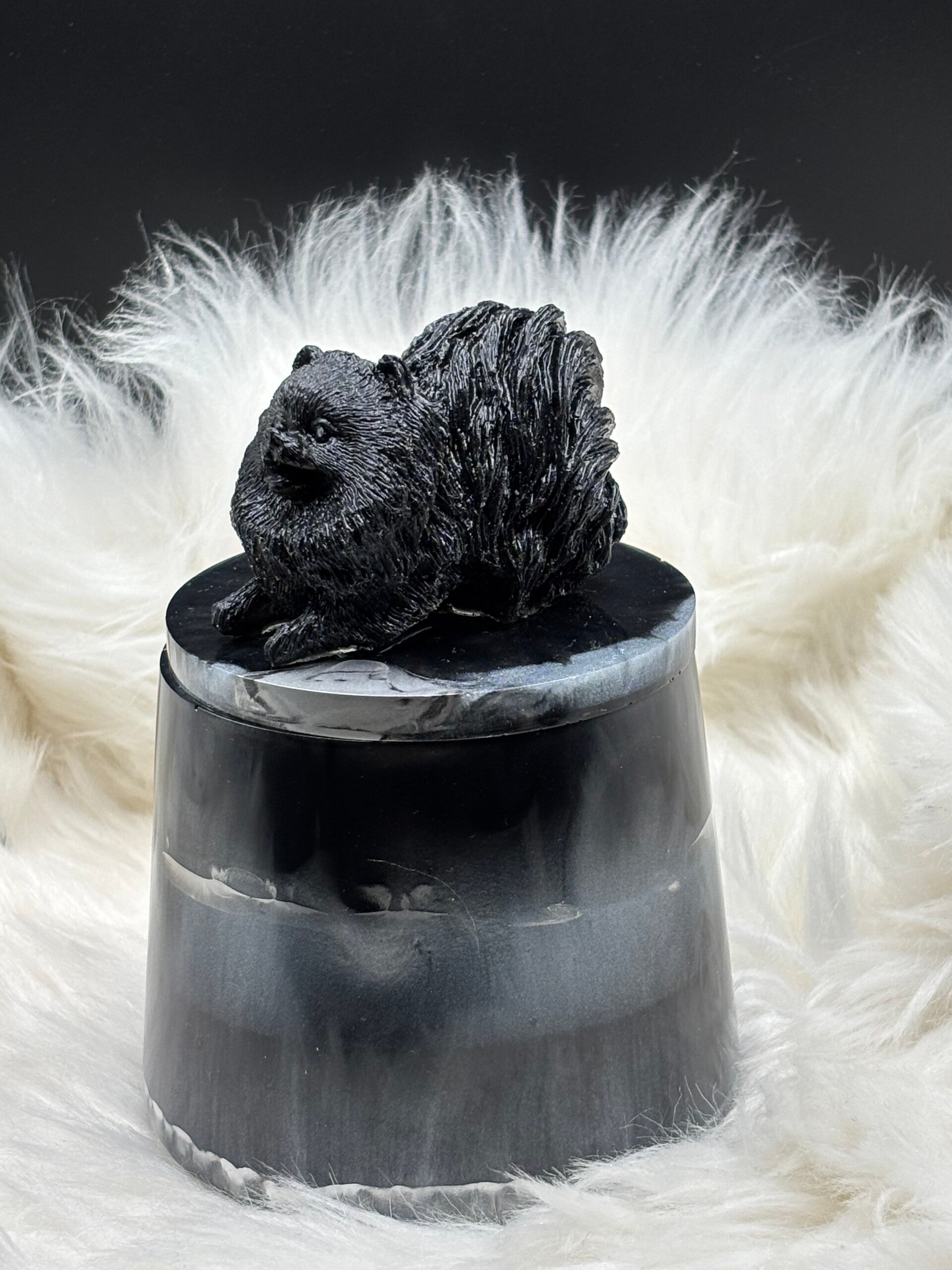 Zeer aparte as-urn voor as van een franse bulldog of chihuahua in zwart wit zilver