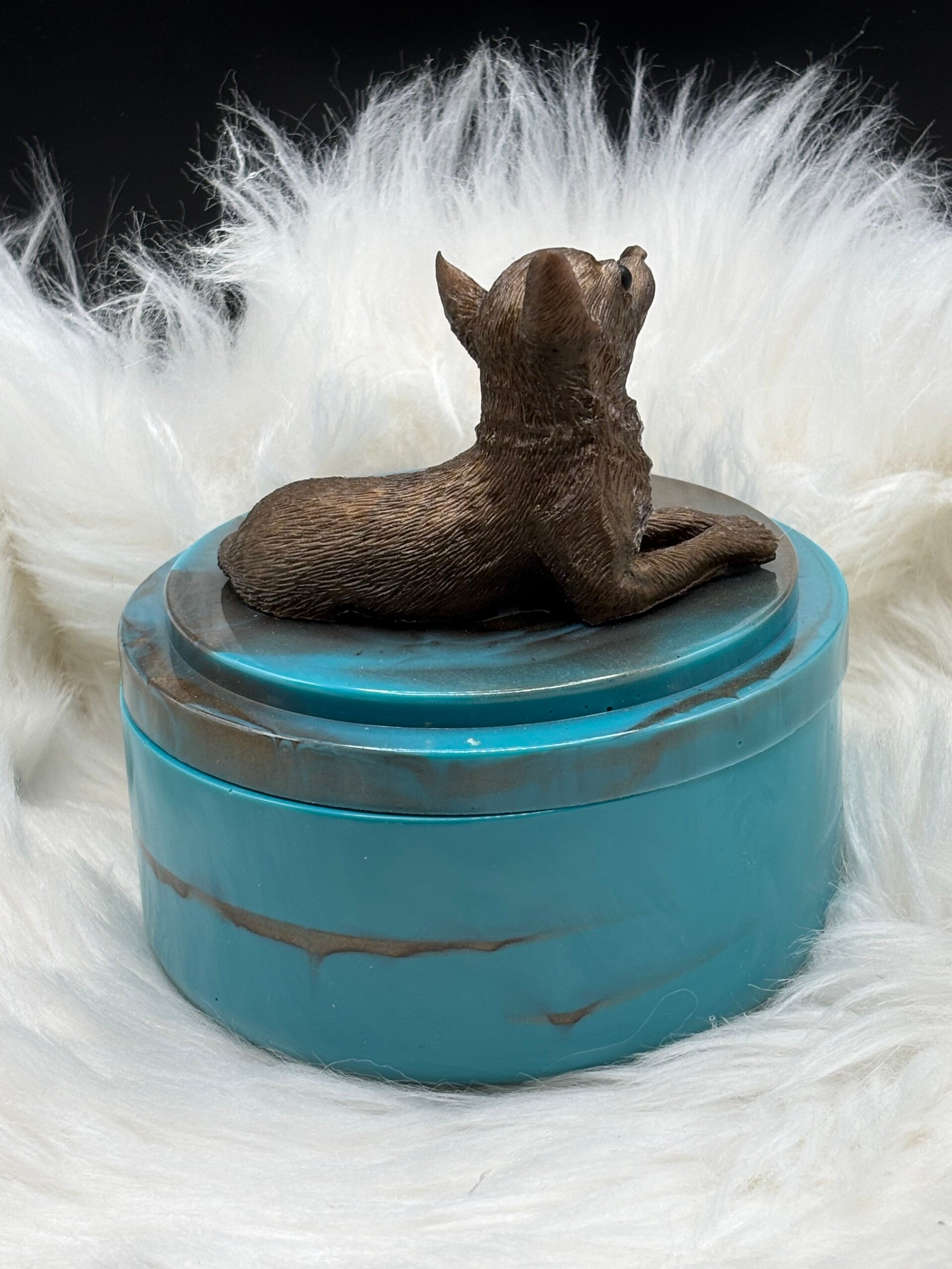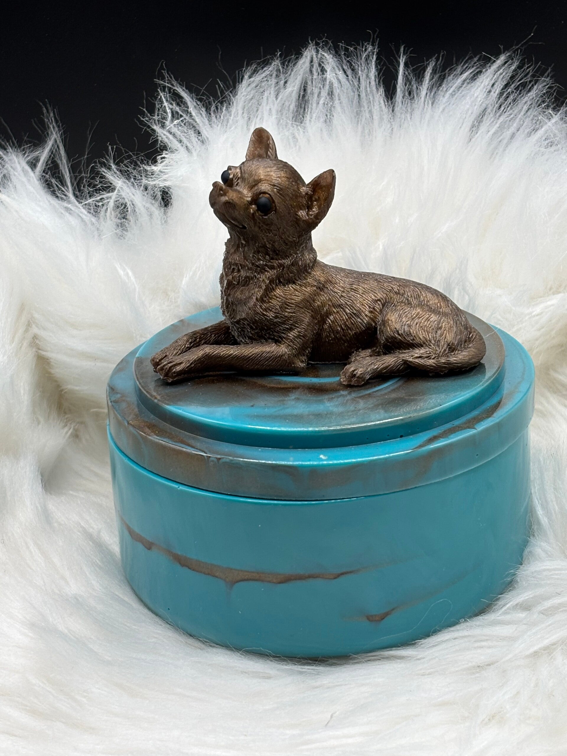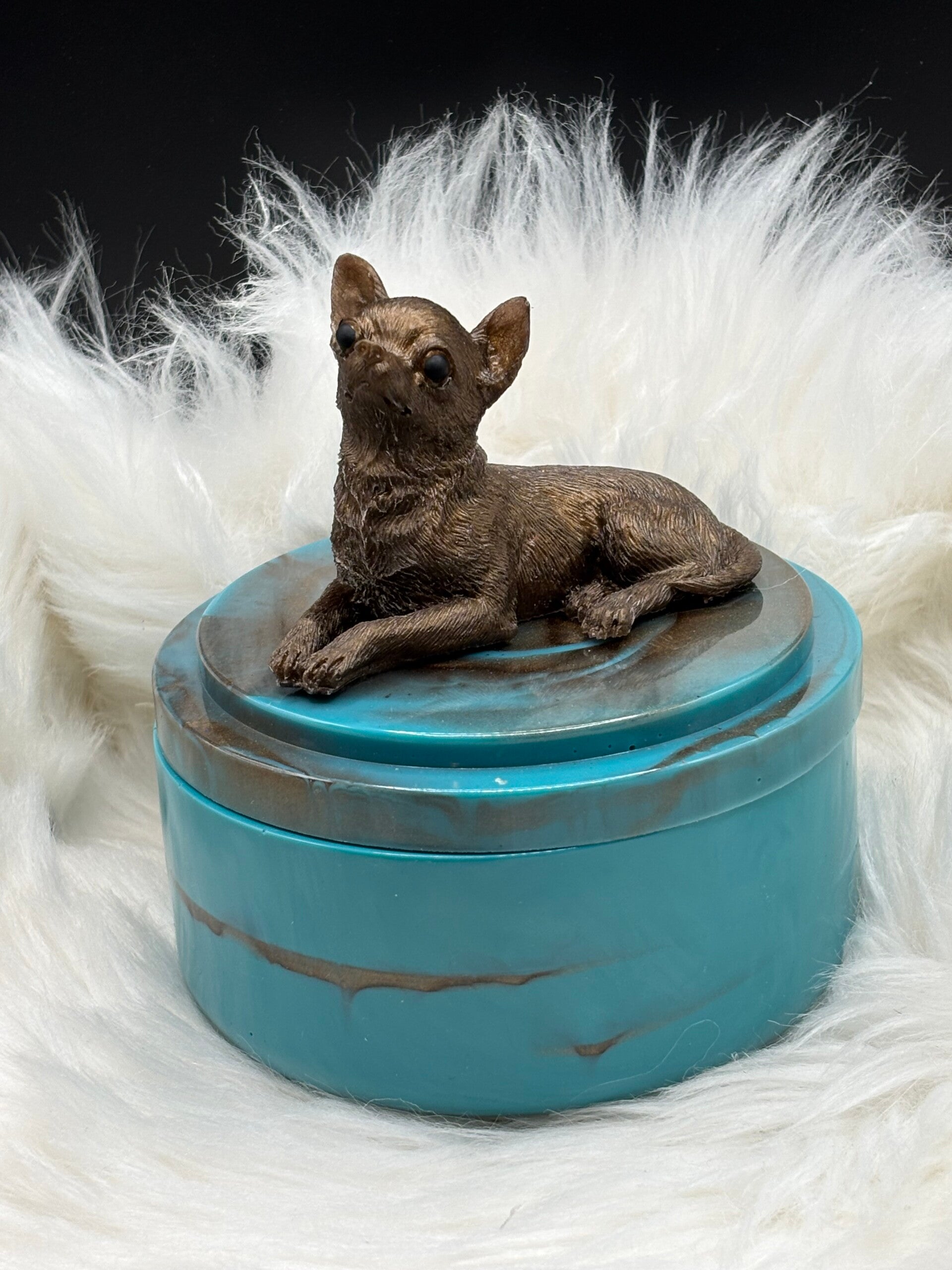 As-urn voor as van een chihuahua of ander klein hondje/diertje in turquoise/brons/goud.