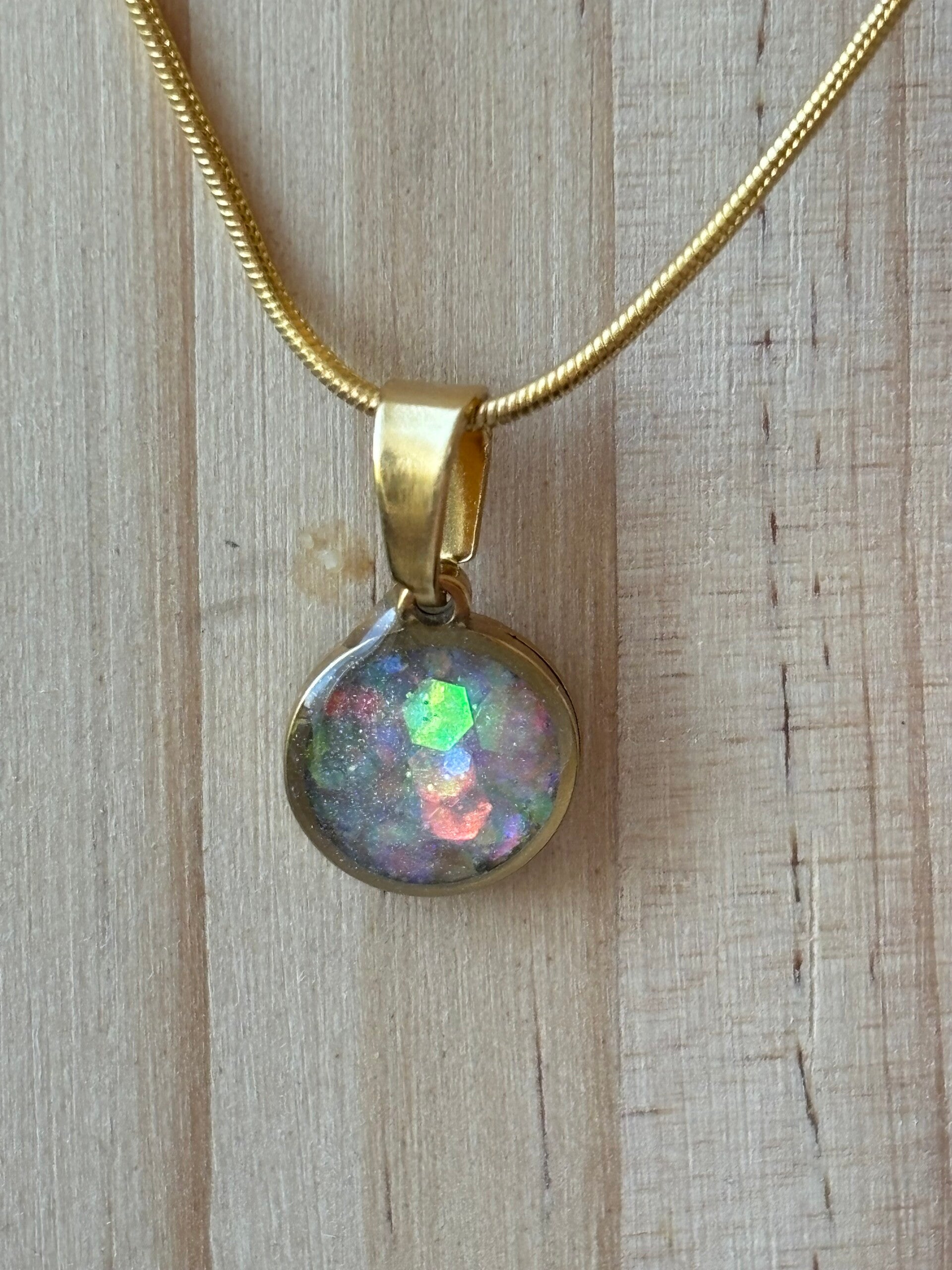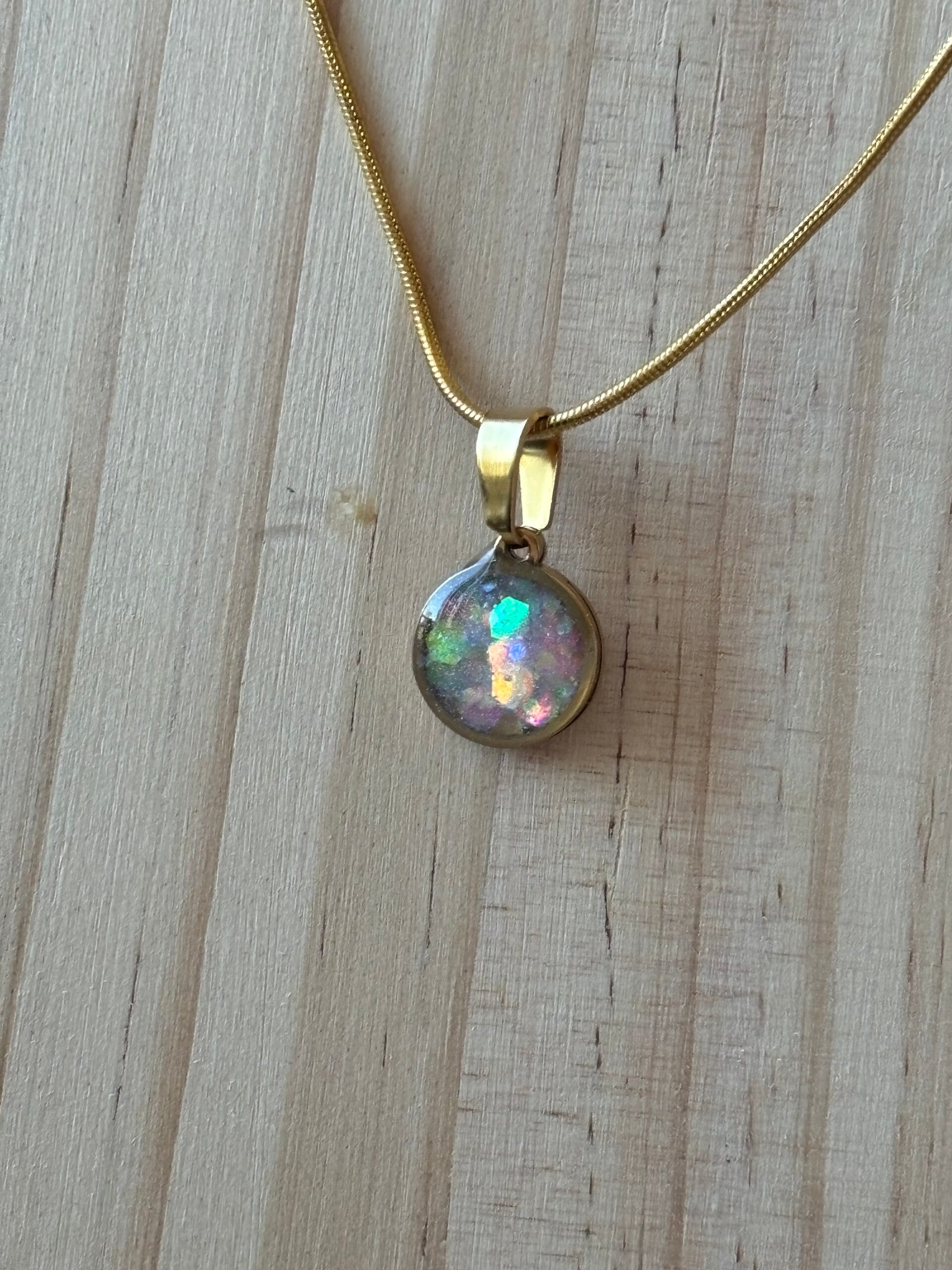 Prachtige rond hangertje met epoxy in goud/wit opaaleffect