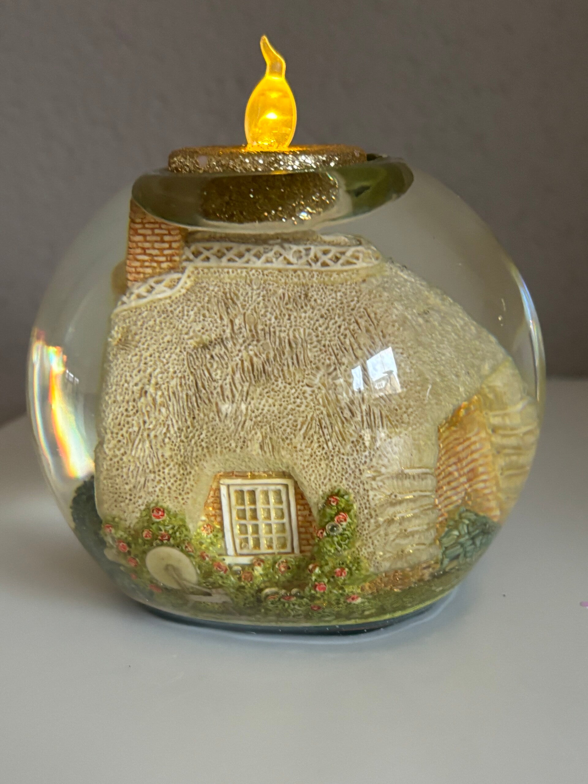 Prachtige en unieke epoxy bol kaarshouder met ingegoten huisje van Lilliput Lane "Petticoat Cottage"