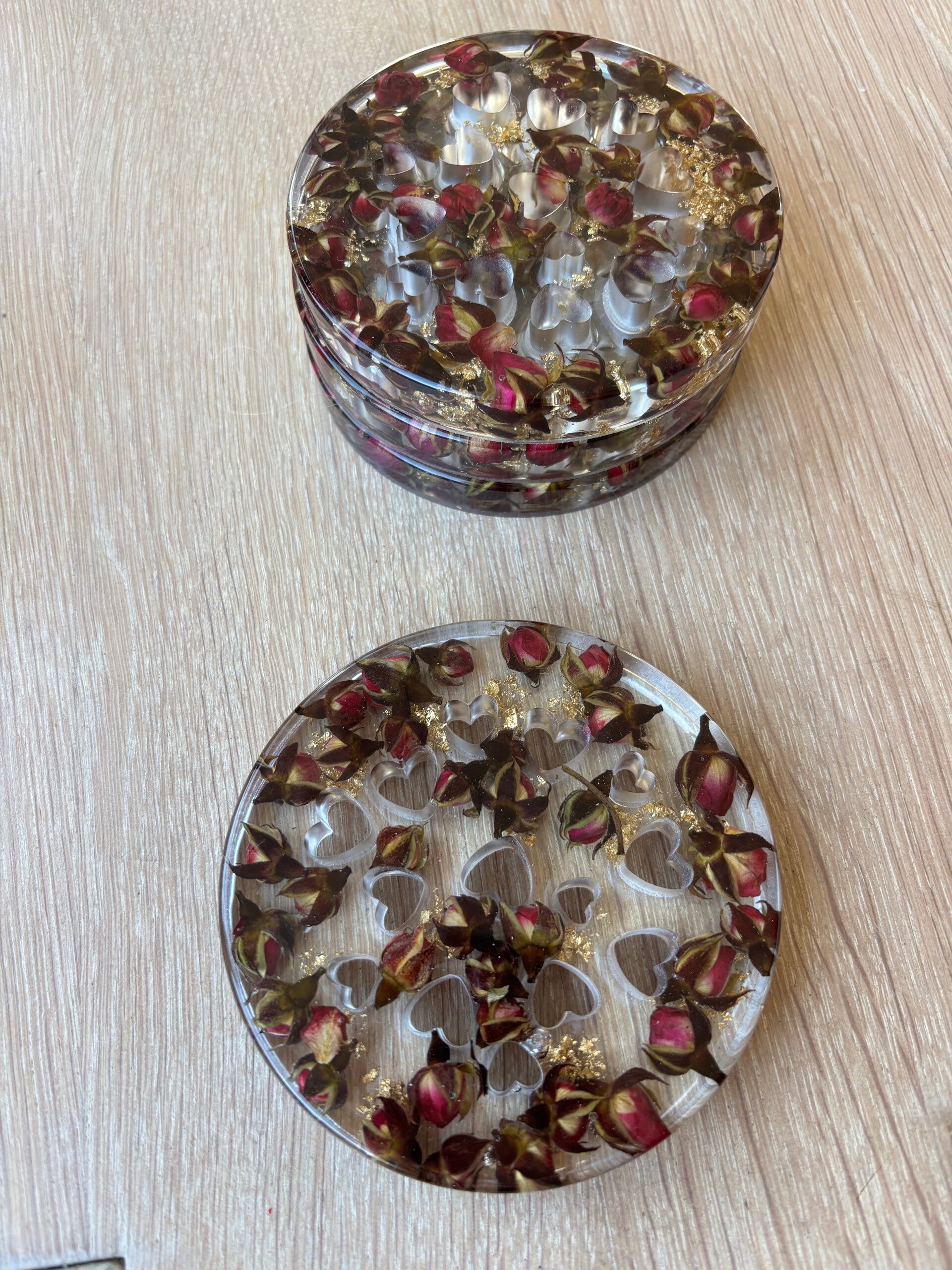 Set onderzetters “Hartjes” in transparant met gedroogde roosjes