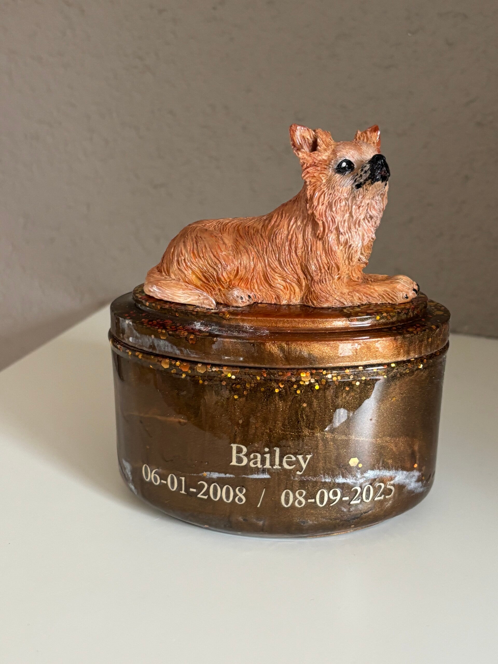 Mooie en unieke as-urn ovaal met gepersonaliseerd hondje/poesje (bewerkt in de kleuren van je eigen hondje)