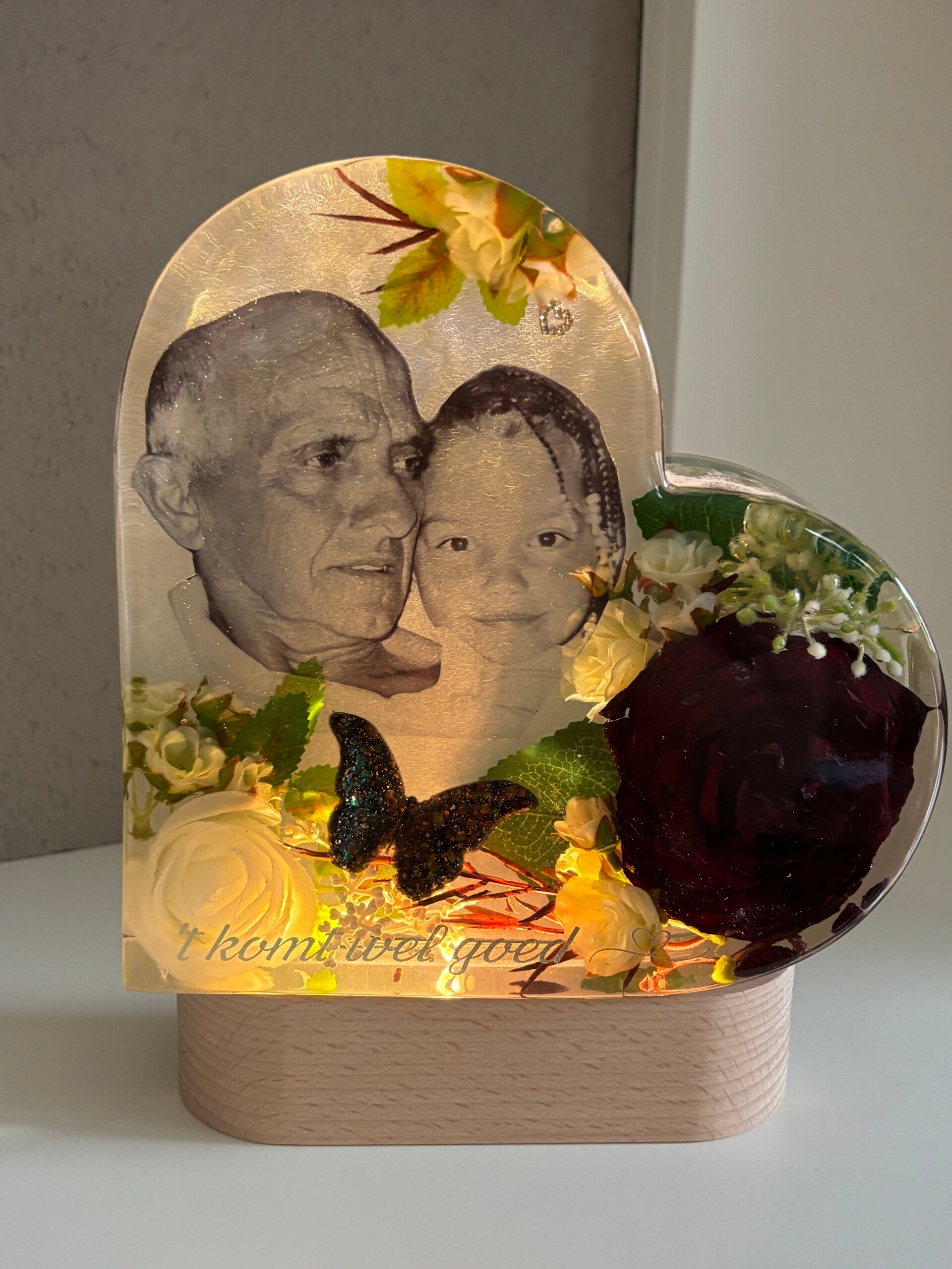 Prachtig handgegoten epoxy gedenkhart met ingegoten bloemen en foto. Het hart is staand te plaatsen op de zijkant.