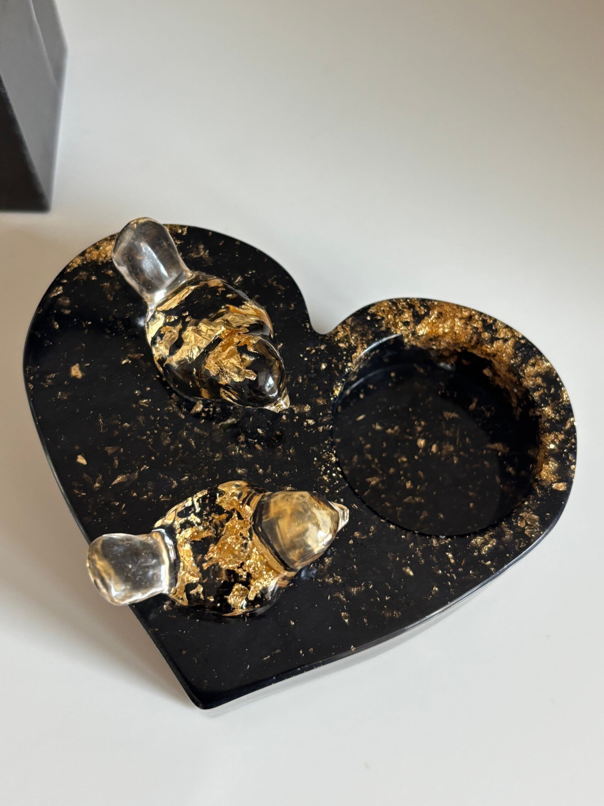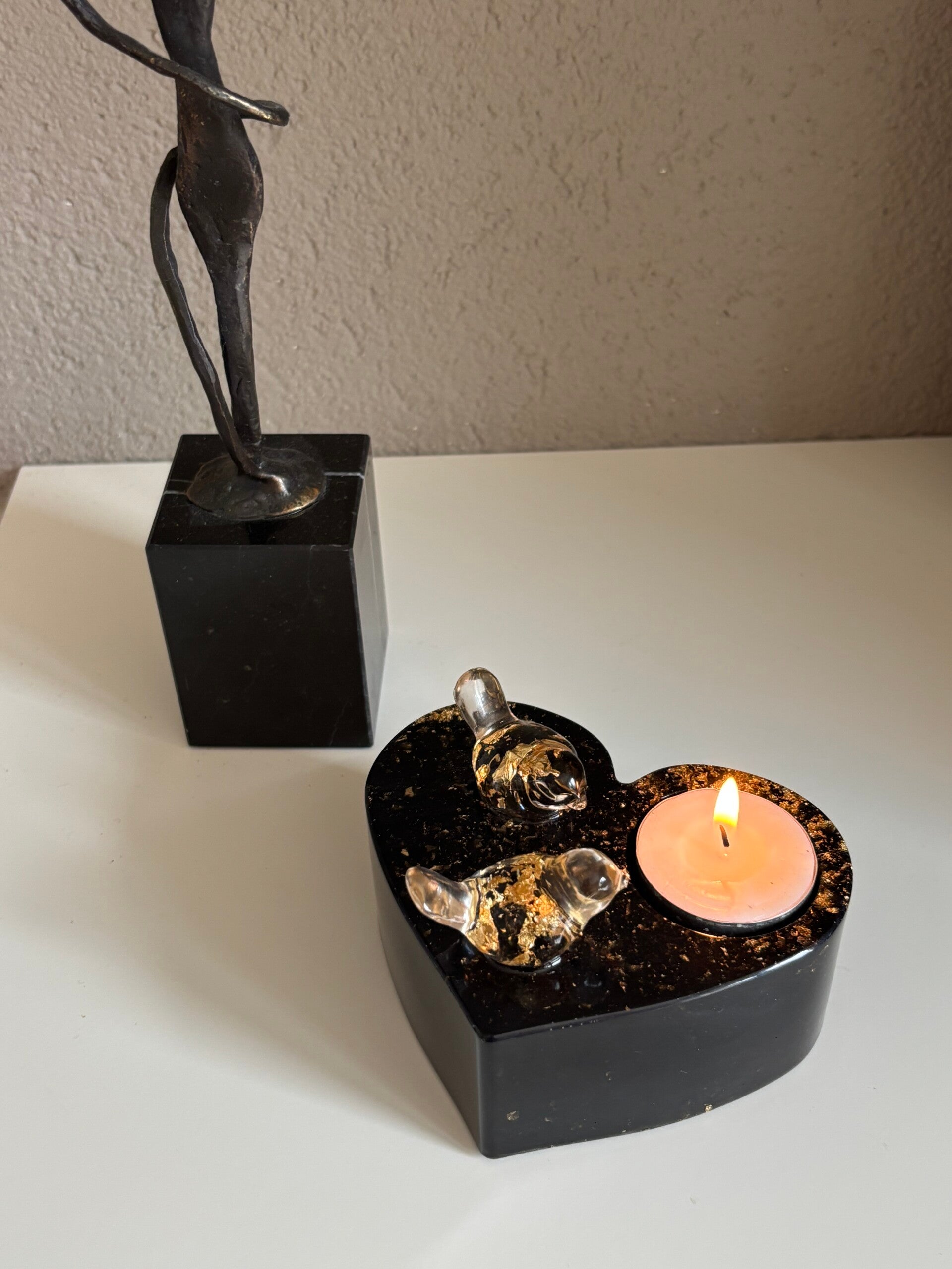Prachtige Kaarshouder hart met vogeltjes in zwart/goud/transparant.