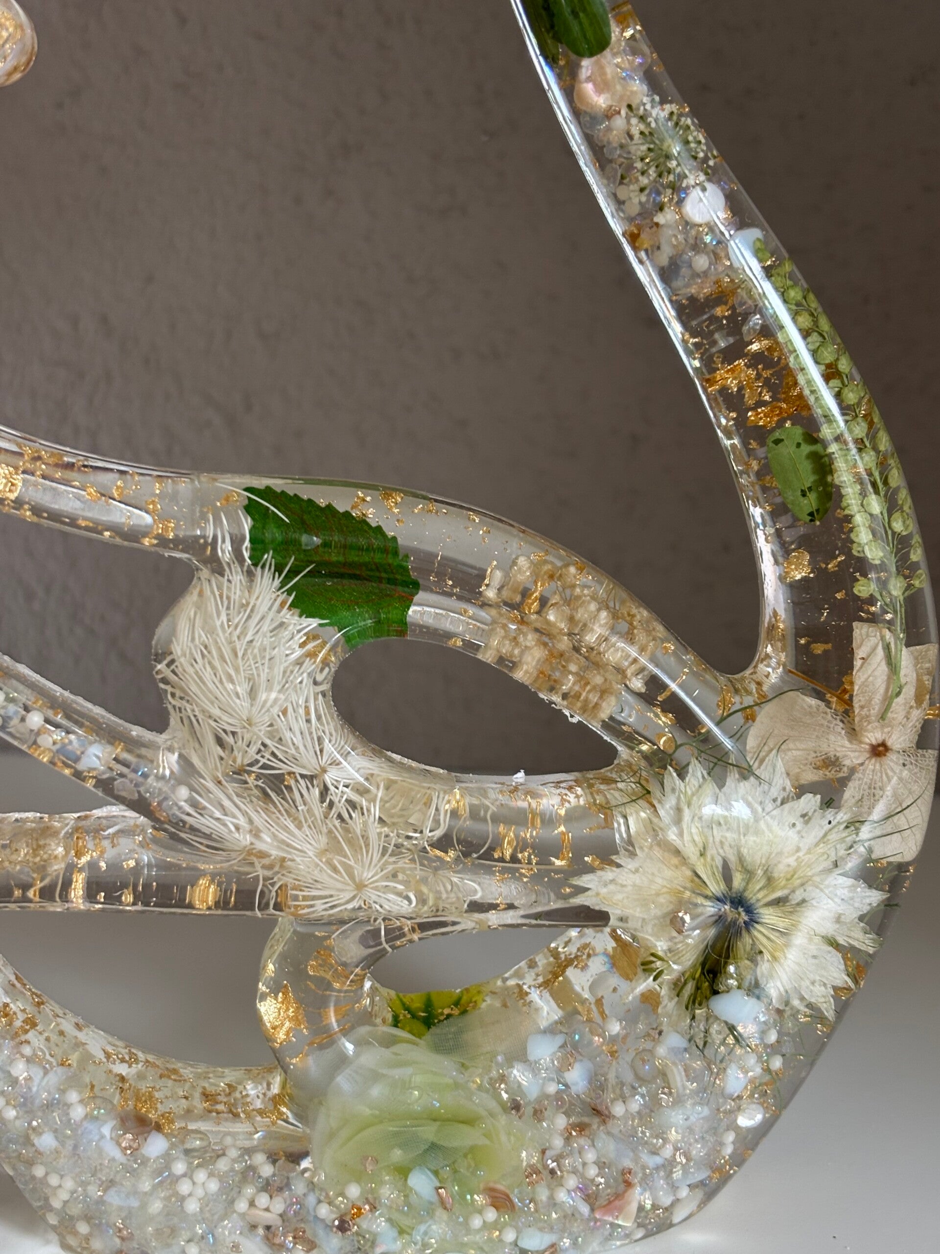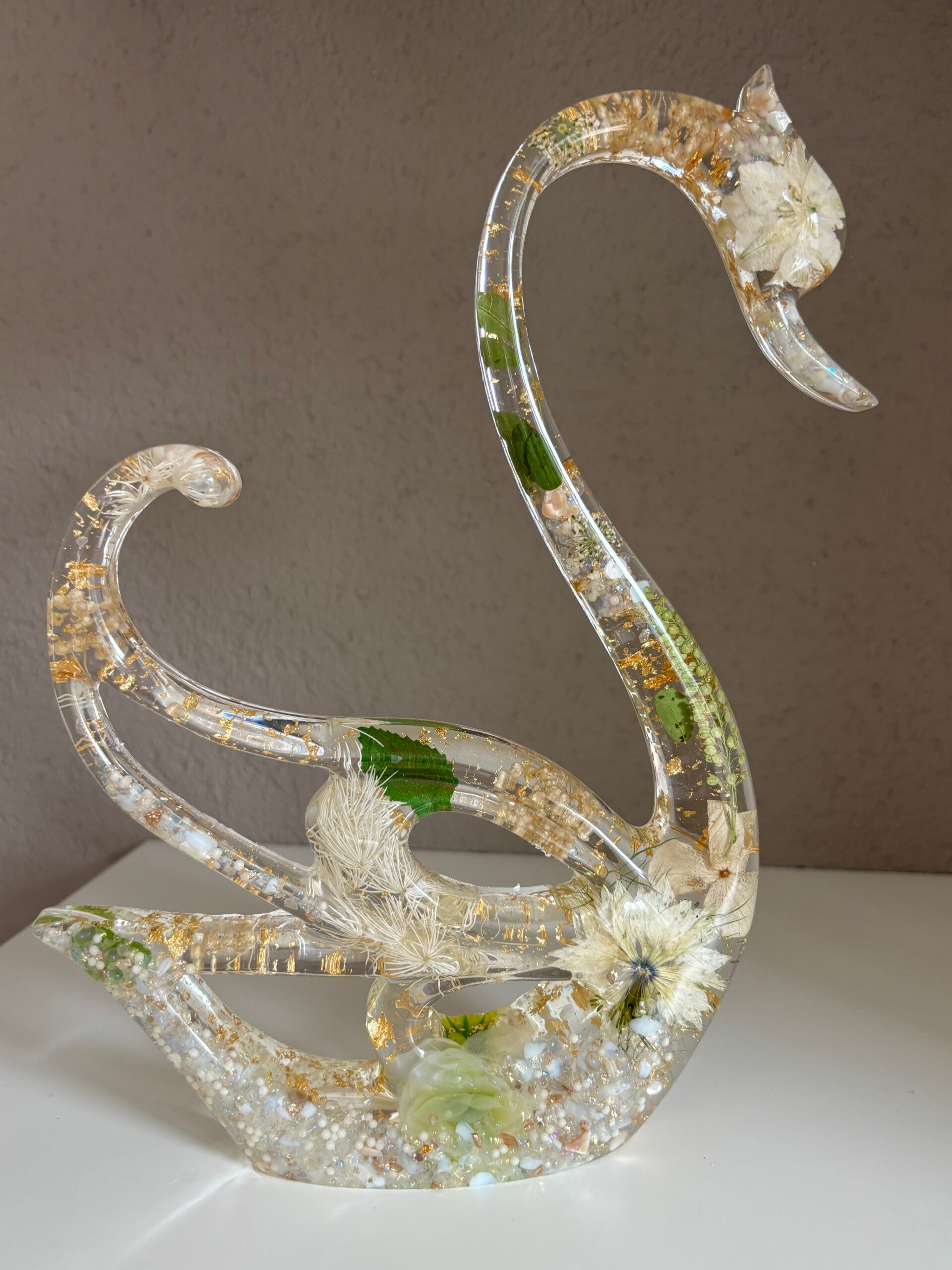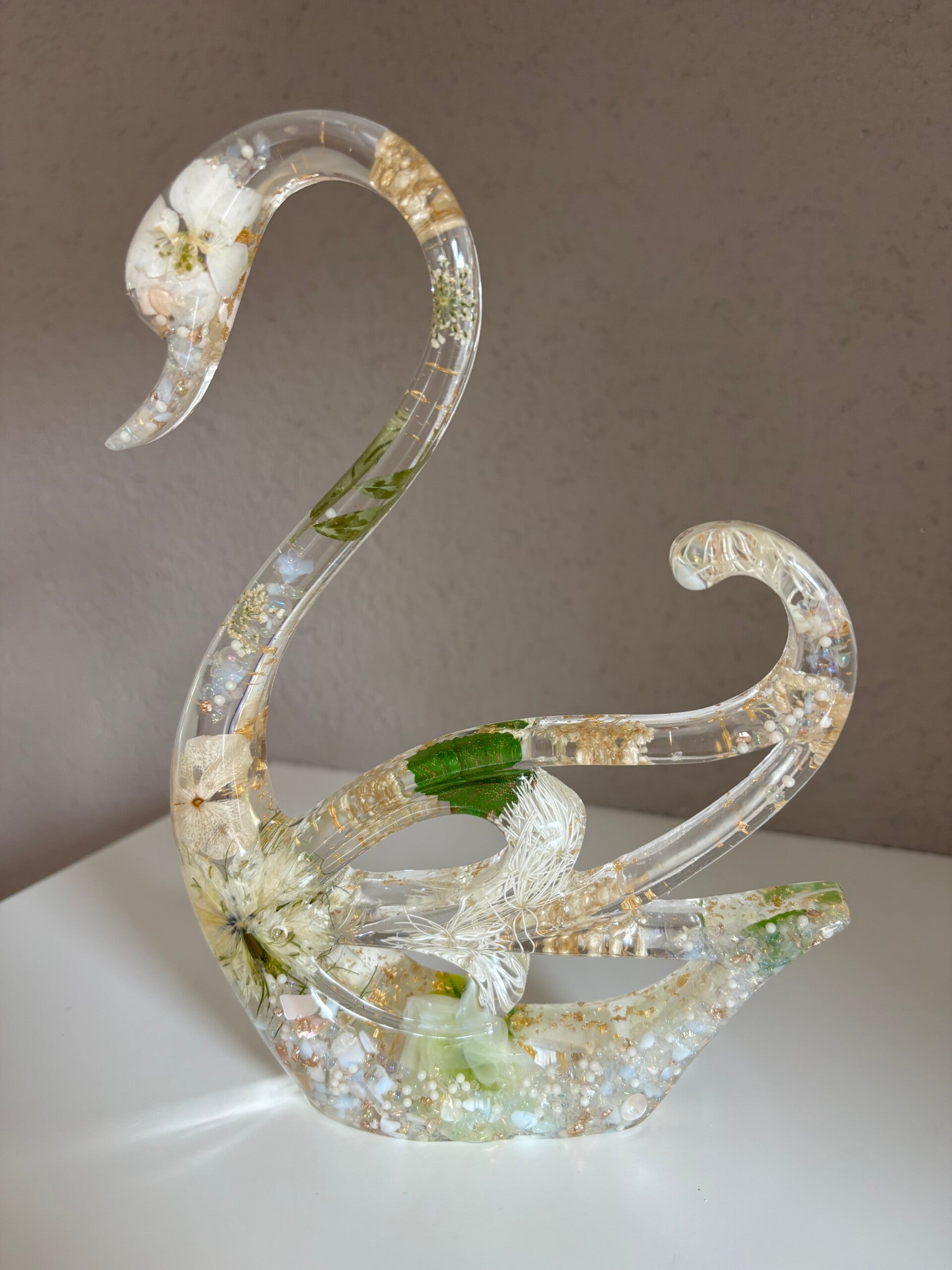 Prachtige set decoratieve zwanen in transparant en witte droogbloemen.