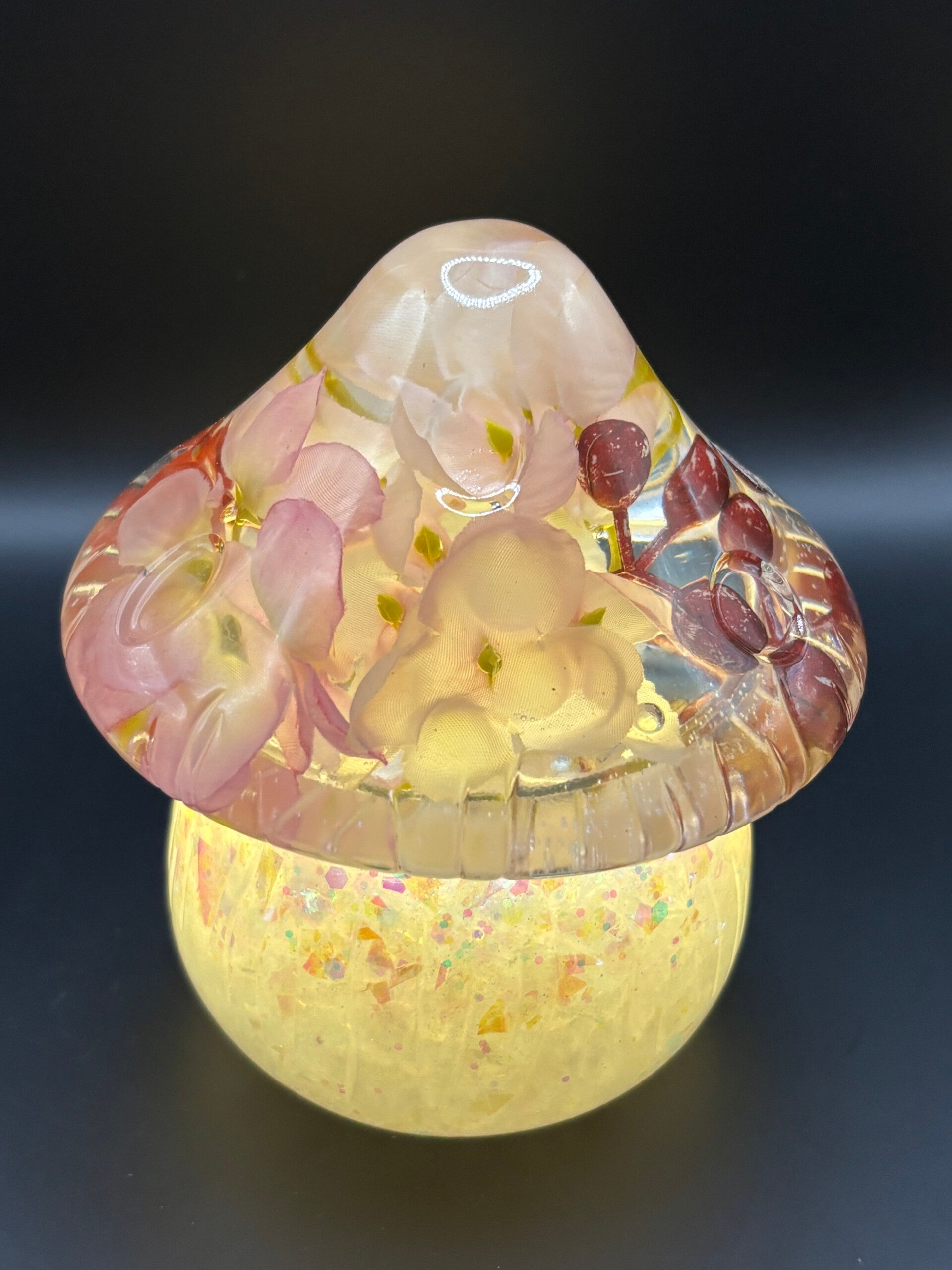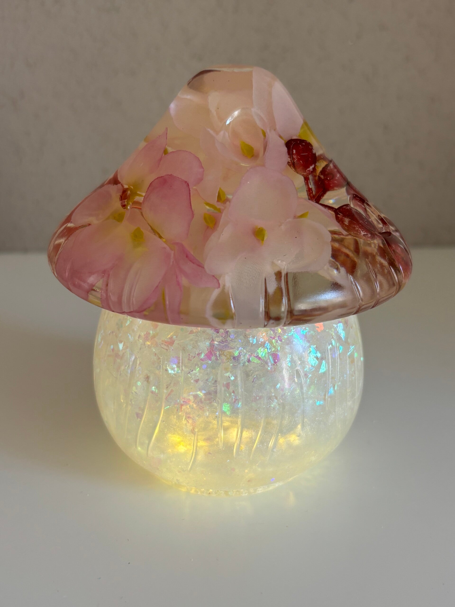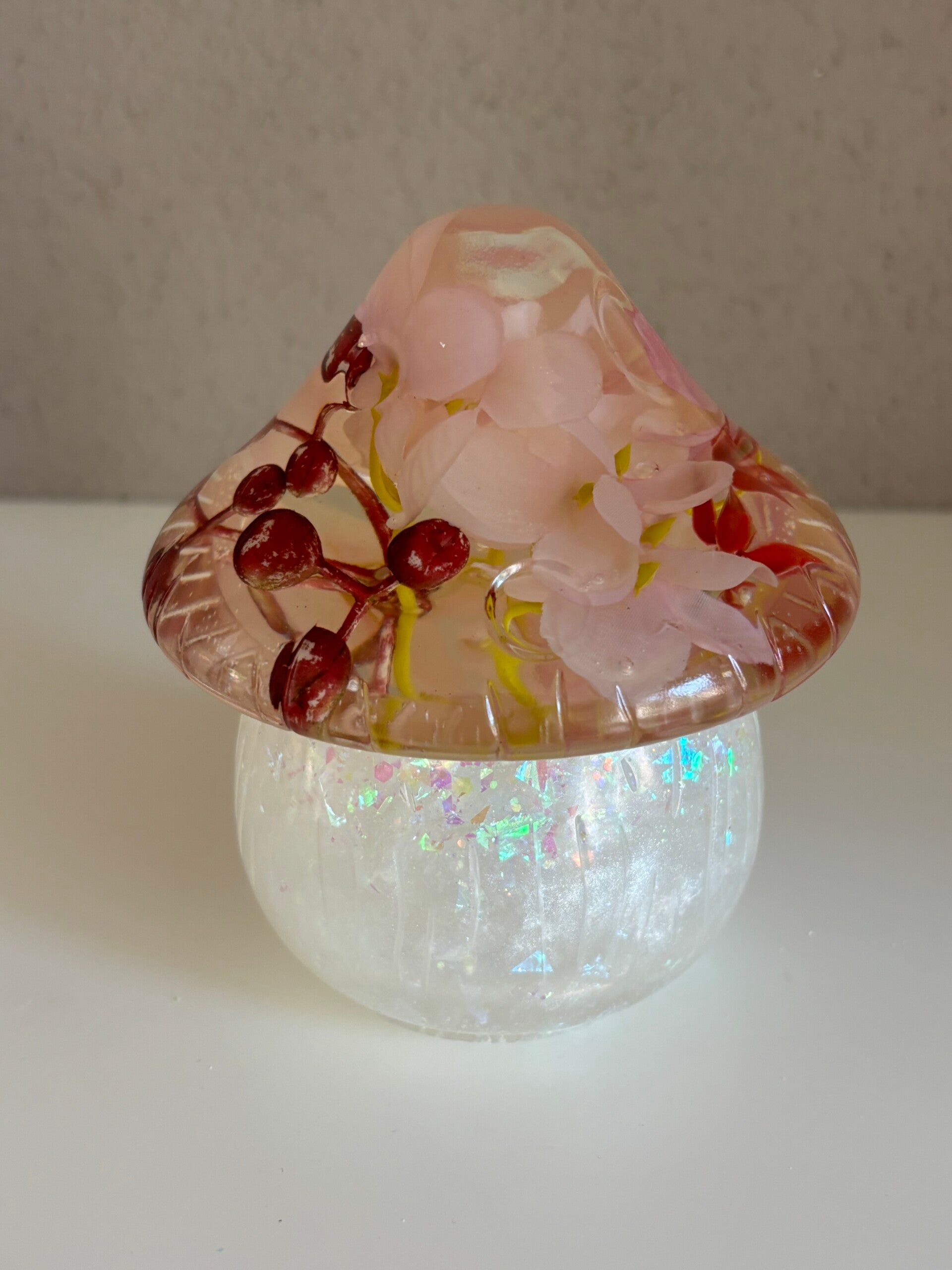Pot “paddestoel” met led-lichtje. Deksel: transparant met ingegoten besjes en bloemen in roze tint. Onderzijde wit met sparkle.