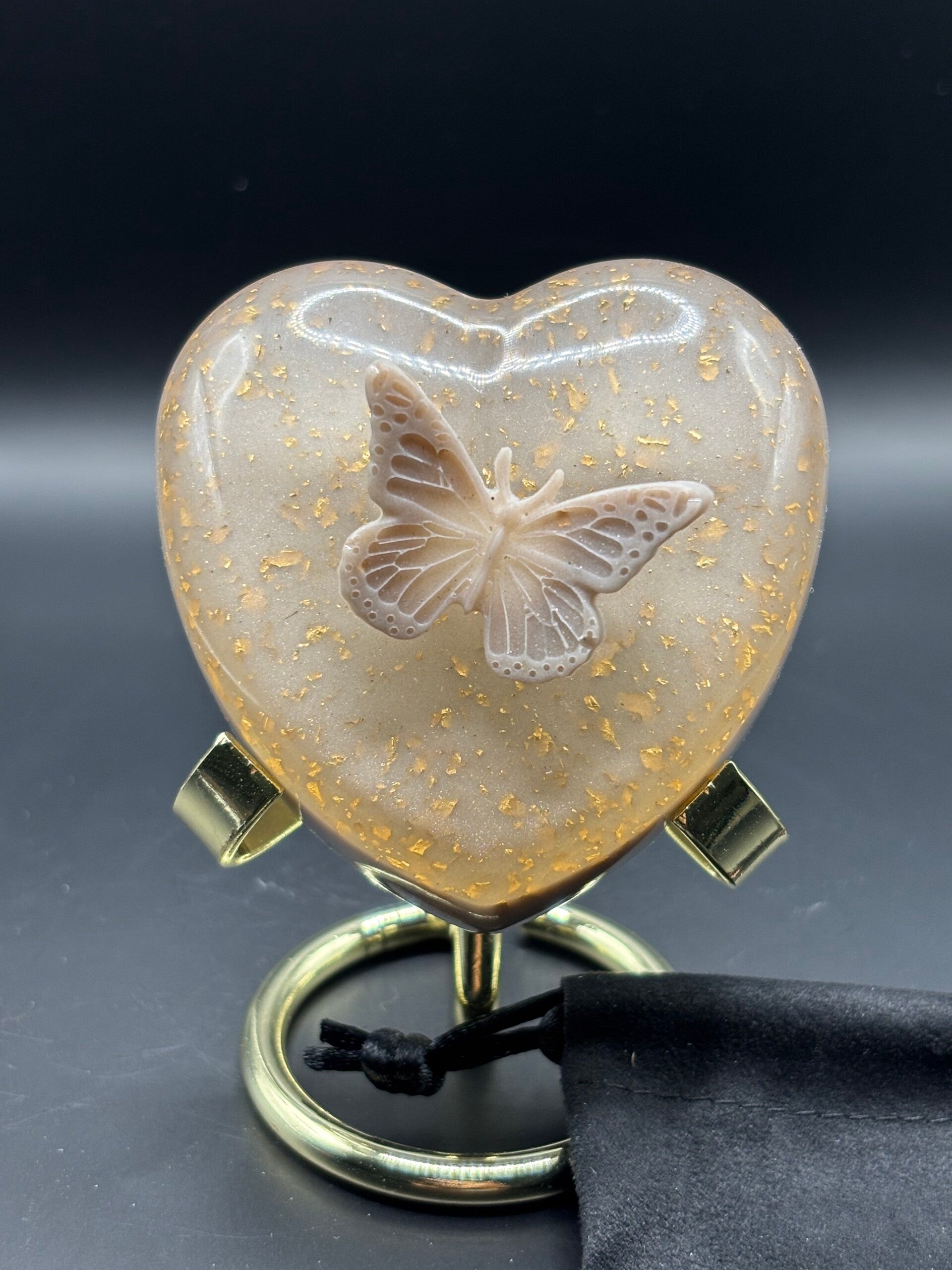 Prachtig ashart maat S in taupe/transparant/goud. Met afsluitbare uitsparing voor as of haar. Eenvoudig te vullen en af te sluiten met de bijpassende afsluitdop. Gegoten met epoxy, handwerk.