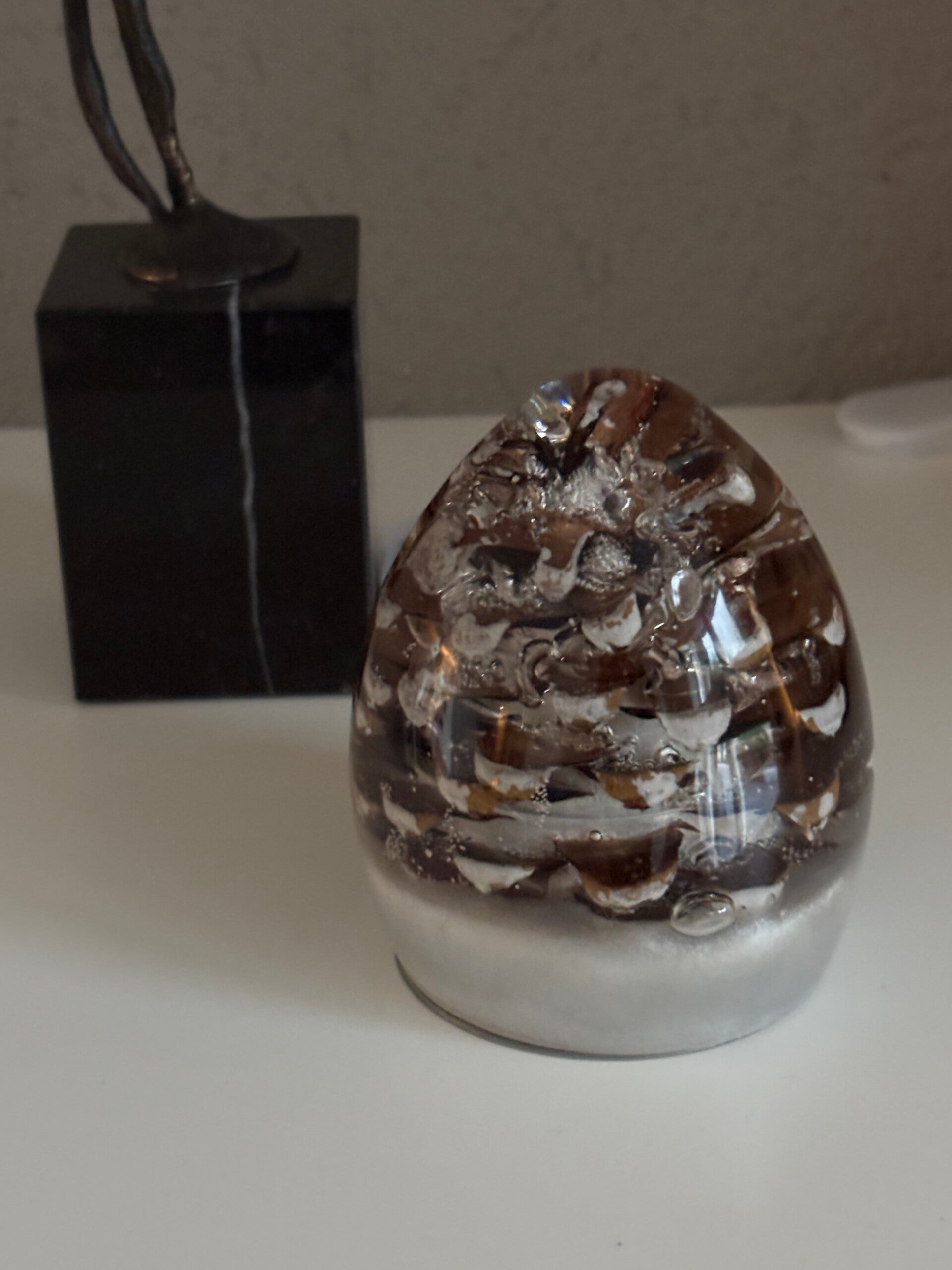 Sfeerlampje "dennenappel". In dit lampje is een echte gedroogde dennenappel gegoten. De puntjes van de dennenappel zijn wit.