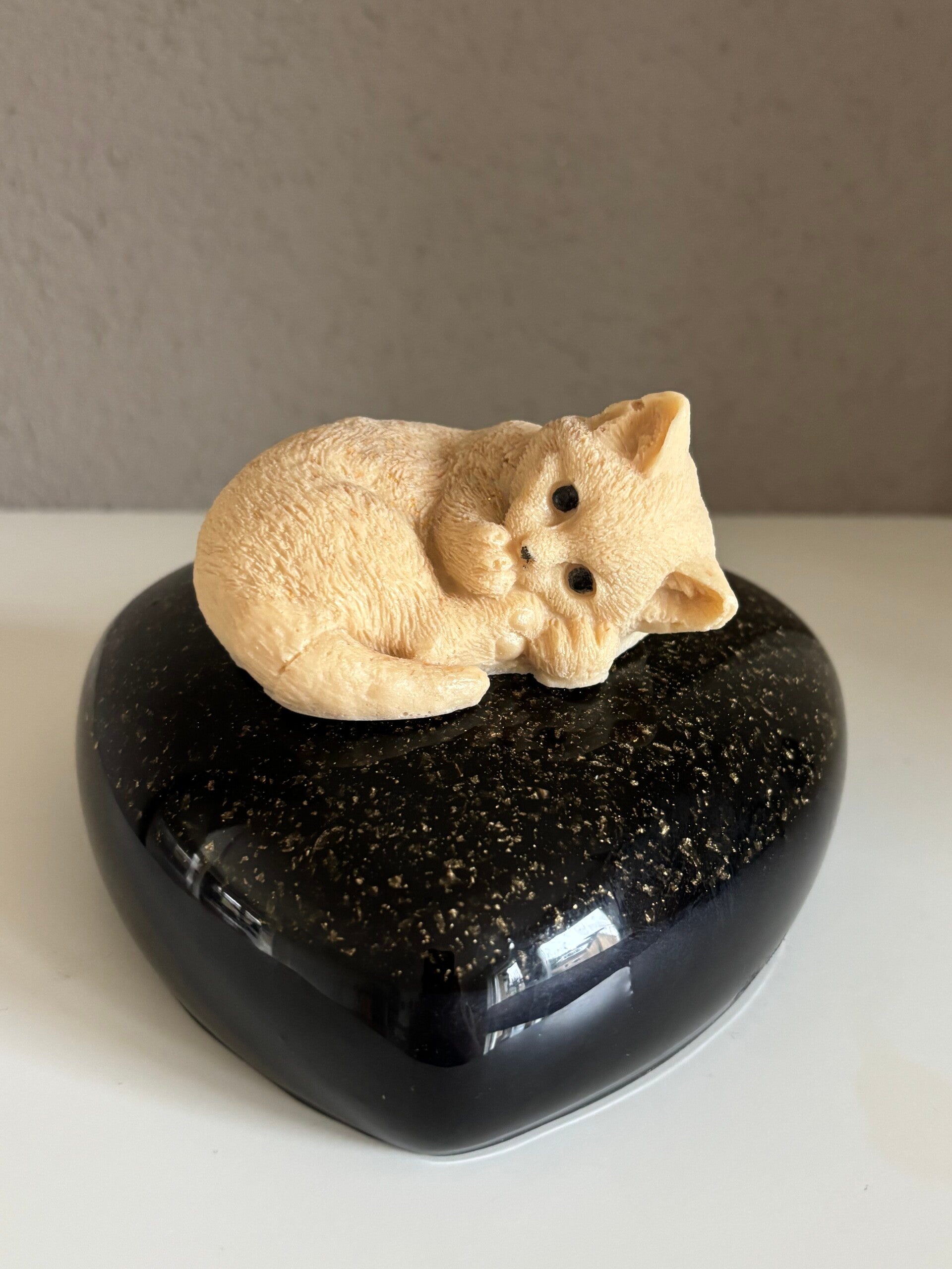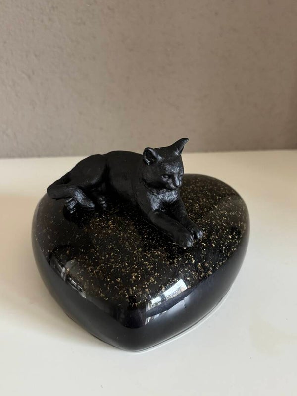 Prachtig ashart maat L in zwart/goud met afsluitbare uitsparing voor as of haar. Op het hart kan een poes, hondje of iets anders worden gemaakt naar jouw wensen. Neem contact op voor de mogelijkheden.