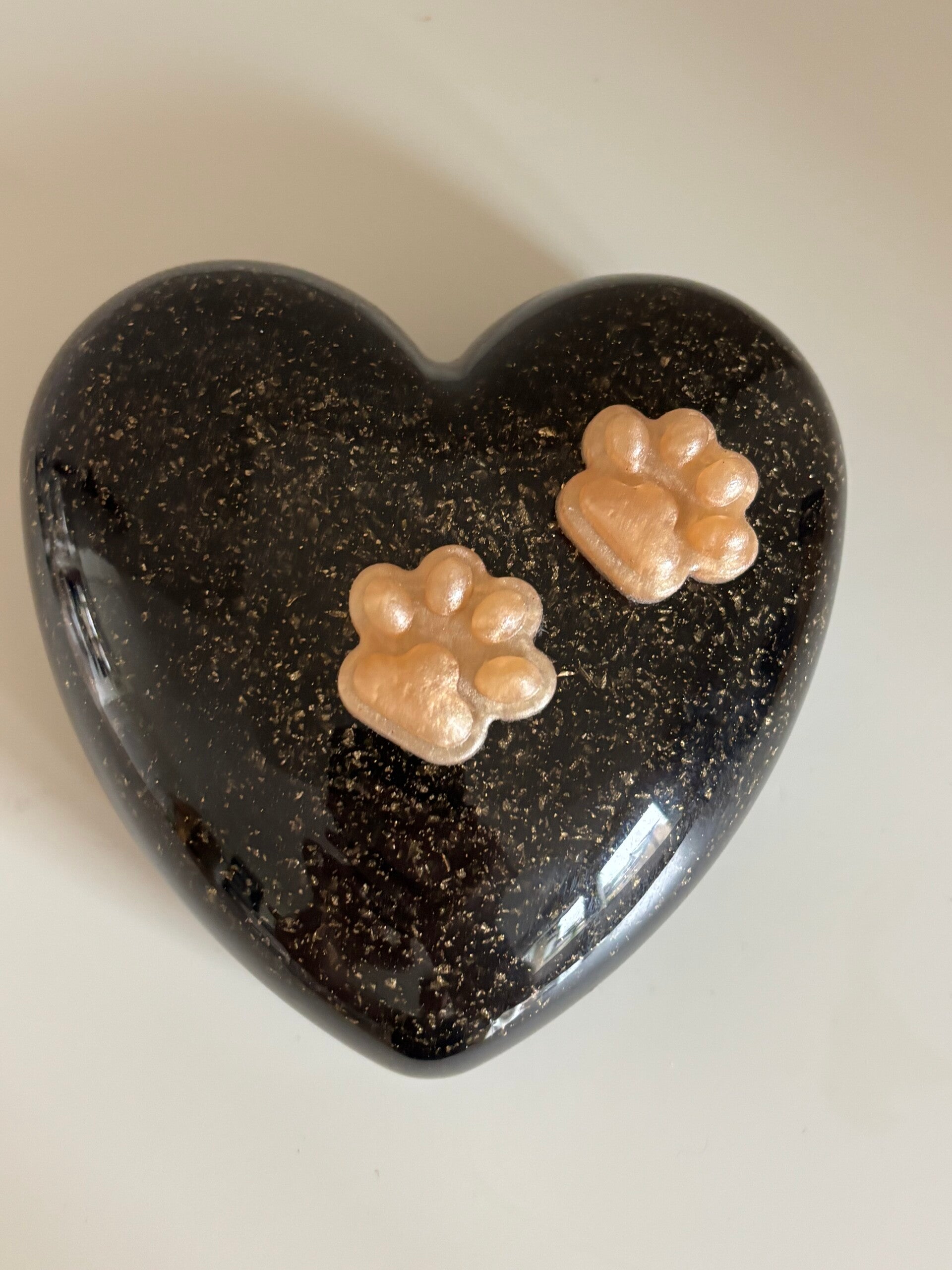 Prachtig ashart maat L in zwart/goud met afsluitbare uitsparing voor as of haar. Op het hart kan een dierenpootjes, poes, hondje, vlinder of iets anders worden gemaakt naar jouw wensen. Neem contact op voor de mogelijkheden.